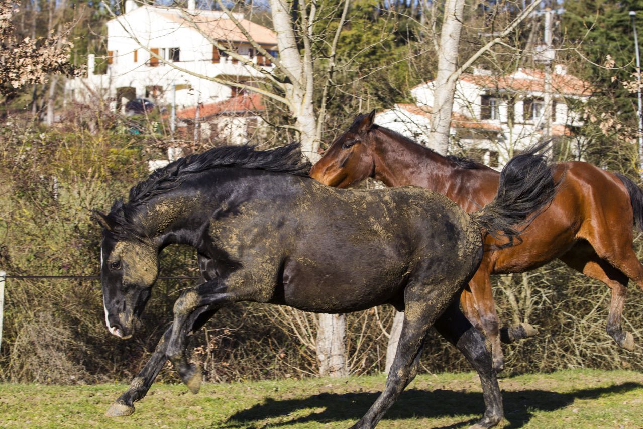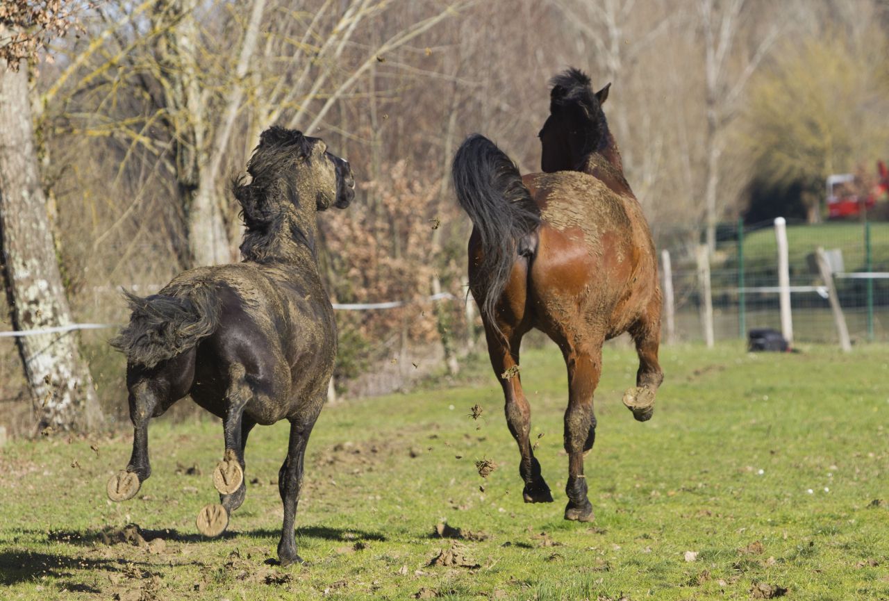 | Dire merci | Alors alors.... On commence, une fois n'est pas coutume, par lâcher Vicky dans la prairie (ils sont cantonnés à la forêt (3ha) pour laisser le seul hectare de pature se reposer en hiver) Mon vieux beau, toujours aussi fringant (je craignais une baisse de régime qui aurait pu expliquer les ardeurs de poulichon à se croire le chef), nous fait quelques jolis galops ![]() ![]() vent du cul dans la plaine ![]() poulichon est à la lisière du bois, il galope le long de la clôture.... alors on le fait rentrer dans l'arène! ![]() Il rejoint dare dare Vicky, et commence son petit manège d'intimidation.... ![]() Vicky n'a pas l'air de s'y intéresser, et part se rouler direct... avec poulichon qui vient faire le tour juste au mauvais moment! ![]() ... pour se rouler lui-même 30 secondes après ![]() à ce moment-là je me suis dit qu'ils ne devaient pas s'entendre si mal, pour se rouler ainsi l'un avec l'autre ![]() les galopades commencent.... et à ma grande surprise, Vicky garde souvent la tête, malgré les efforts de poulichon pour être le plus aérodynamique possible ![]() (vicky n'est déjà pas une flèche, il se fait battre à plate couture par nadja!) poulichooooonnnn ![]() *suite* Message édité le 17/02/13 à 19:02 |