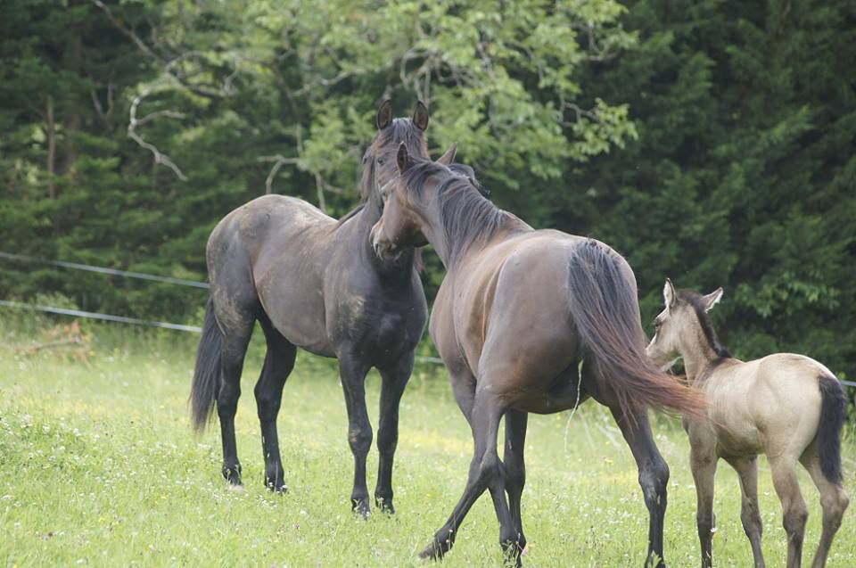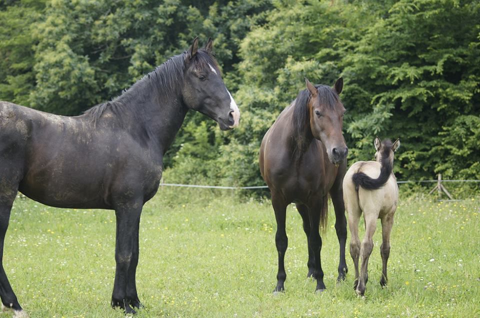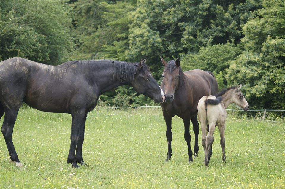 | Dire merci | Bonjour bonjour! Commençons ce topic-fleuve par une petite présentation des protagonistes ![]() Akanto, dit « poulichon », jeune étalon PRE noir né le 19 mars 2010 d’Ebanisto 6 et Nocturna XIII, à l’élevage Rozière. Un "pti jeune" aux multiples adjectifs, dont on retiendra particulièrement celui-ci : «calme ». Posé, réfléchi, c’est un élève modèle, quoique très gourmand. A côté de nos sorties "loisir" (il est labellisé Elite Loisir junior et monté, et on commence le TREC), Akanto commence le dressage de façon un peu plus sérieuse avec un cavalier, et commence à avoir des résultats très encourageants On fera d'ailleurs la finale européenne des MCI en novembre prochain en Belgique! Mais le gros de son emploi du temps, c'est de vivre au pré avec ses juments, une vraie vie de famille... ![]() Ma première jument, c'est Lebrera XXXVI, jument PRE PP née en 1999. Je la connaissais avant Akanto, j'ai failli réserver son poulain 2010, mais les aléas de la vie on fait que.... et puis la chance aidant, j'ai pu la racheter en 2012 car je rêvais d'un poulain d'elle, qui plus-est avec Akanto! Elle est la mère d'Eléio et de Falcon d'Auréa (né le 7 juillet 2015). ![]() Et le petit Falcon, surnommé Bambi ![]() ![]() Vient ensuite Eléa, jument de race Schwarzwalder née en 2007, une race de demi traits allemande (Forêt Noire). Eléa m'a été confiée par sa propriétaire pour une durée indéfinie, c'est une splendide jument, championne de M&A dans sa race et mère de champions également elle est très douce et caline Elle est la mère d'Elégie d'Auréa, née le 13 mai 2014, et de Faline d'Auréa, née le 3 juillet 2015. ![]() La petite Faline, à l'image de sa robe....elle a le feu! ![]() Enfin, Nikita (PRE baie, demi soeur de Lebrera par le père) et sa fille Féérie nous ont rejoint au cours de l'été, pour un poulain avec Akanto en juin 2016 ![]() Sans oublier Vicky, qui nous a quitté brutalement le 12 avril 2015.... Mon premier cheval, que j'ai rencontré 18 ans auparavant, dont j'ai rêvé d'être la propriétaire pendant 8 ans, et ce rêve s'est réalisé, durant les 8 dernières années, il m'a suivi à Lyon, en Alsace, et à Toulouse, où il a fini ses jours, entourés de sa "famille", toujours beau, toujours fier, un cheval exceptionnel, un sacré carafon mais incroyablement gentil et tolérant.... mon « vieux beau » qui me manque.... Lien ![]() Voici donc les chevaux qui composent mon jeune élevage, l'élevage d'Auréa.... à suivre au fil des pages... Lien Message édité le 23/12/15 à 11:57 Message édité le 01/01/16 à 22:03 |