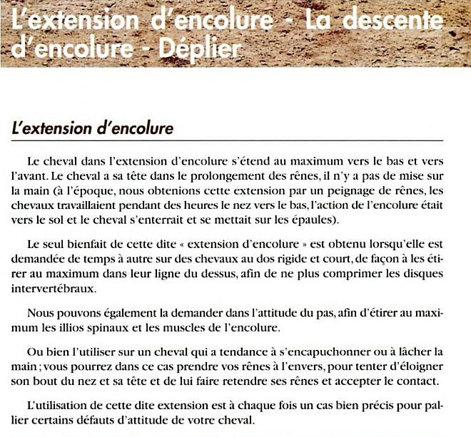 | Dire merci | Je crois pas Al que c'est sur faire ou non des extensions d'encolure que Alezane "critique" mais sur comment et a quelle moment. un extension d'encolure va au délà de 'juste" un cheval bas, la ton texte explique les bien fait, pas le comment biomécanique, hors je crois que la discussion est plutôt la de ce que dit Alezane |