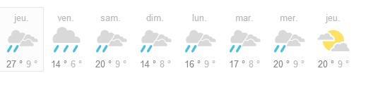 | Dire merci | ah d'accord non mais c'est quoi ce temps pourri j'espère que j'aurai pas la même chez moi sinon faudra que je monte sous la pluie, obligée...Allez un peu de courage, un poncho et c'est parti ^^ |