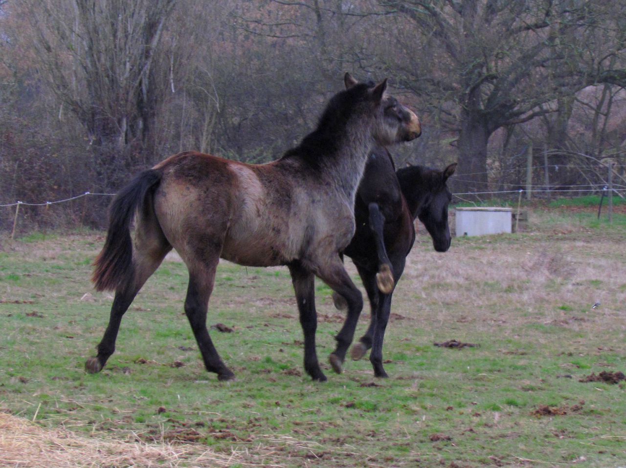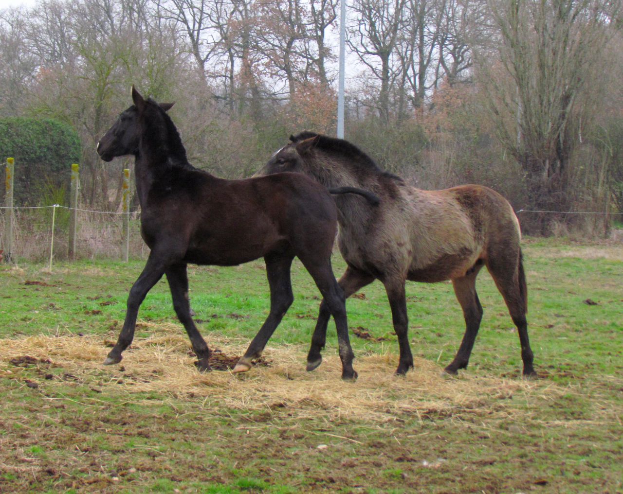 | Dire merci | ben hier j'ai fini de bosser à 13h, et après...ben, fallait rentrer sur Toulouse alors, les photos du jour... Véloz avait donc été intégré au troupeau il y a quelques jours, et Guapa retirée (pour qu'Alpha soit bien sevrée). On a donc remis les 3 poulains dans le troupeau...et ça a swingué Akanto s'est de suite mis à l'écart et a fait son fiérôt...de loin ![]() Véloz jette d'abord son dévolu sur Alpha, qu'il suit comme son ombre ![]() Au bout de 10-15minutes, Akanto se décide à rejoindre le petit groupe en pleine effervescence: il tombe nez à nez avec Véloz, qui se montre d'humeur joueuse ![]() ...mais Akanto ne s'en laisse pas compter ![]() ![]() kéké power ![]() ![]() et zou ![]() J'ai aussi des vidéos sympatoches, mais faut que je trouve un logiciel de montage ![]() |