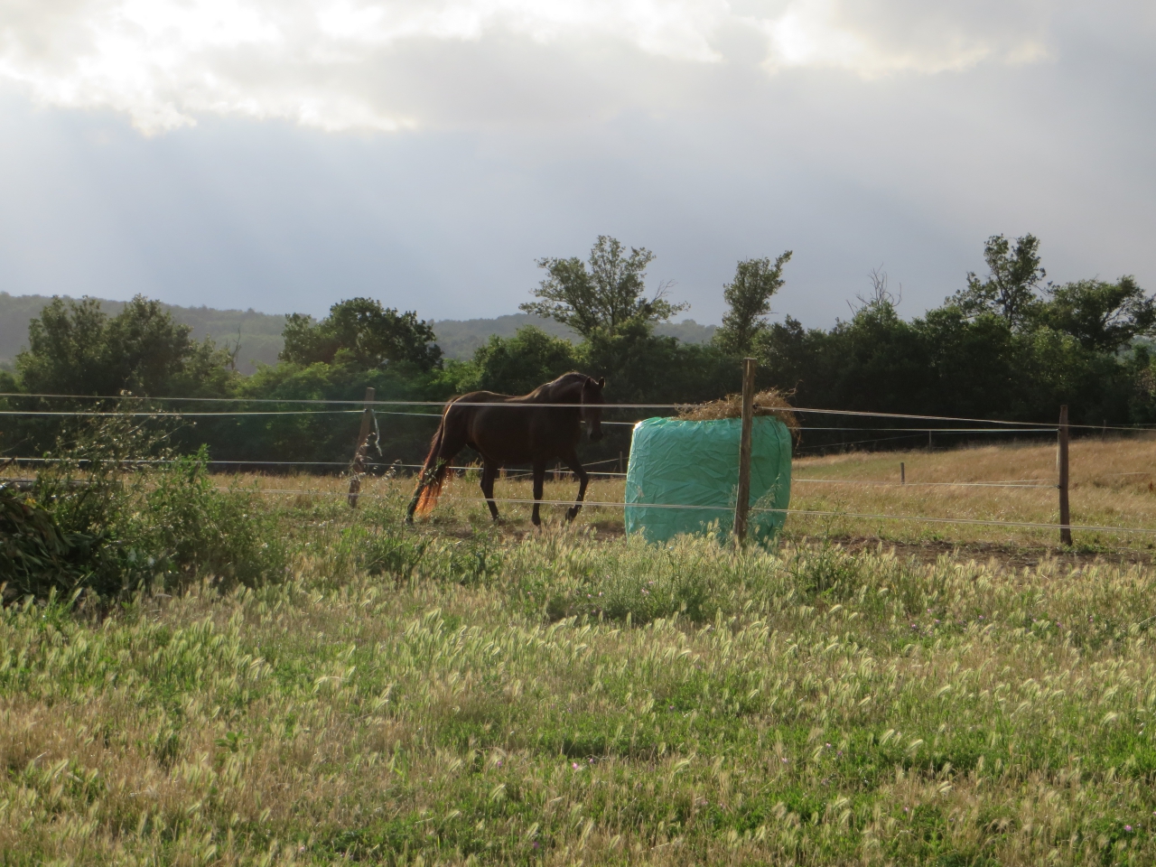Après une tentative avortée d'emmenage discret d'Eléa, je me suis résolue à choper poulichon avec ce que j'avais sous la main (= un bout de tuyau d'arrosage ), je l'ai emmené devant la balle... et bien entendu, vous connaissez la bête....ah, tiens, un nouveau truc, c'est quoi? hoooo du foin, coooool