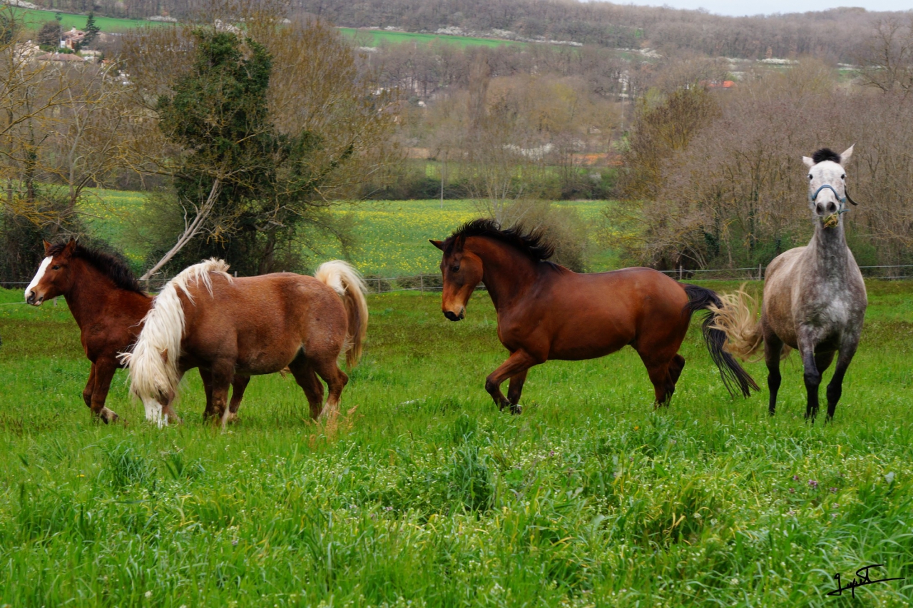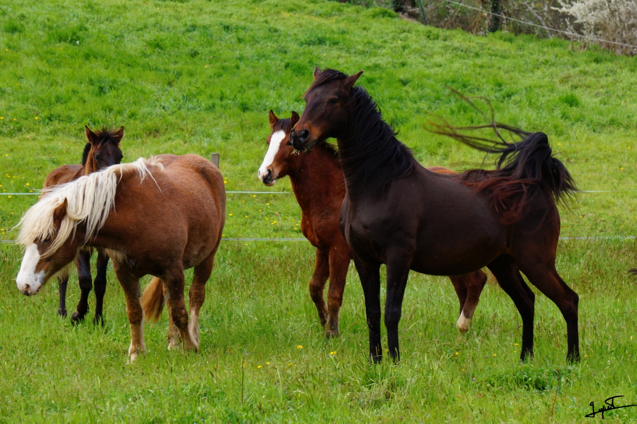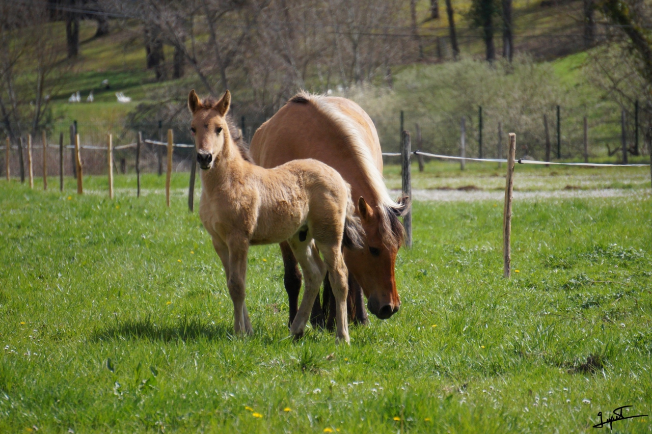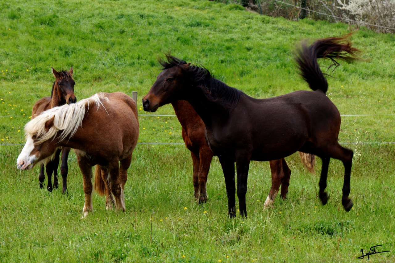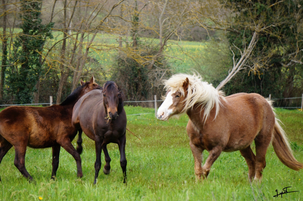 | Dire merci | oui ça progresse de semaine en semaine, c'est cool ![]() aujourd'hui les juments ont rejoint leurs bébés (pour profiter d'un parc de 9000m² où l'herbe poussait trop vite), en compagnie d'Animosa (la grise saillie en aout dernier), on a donc mis les 2 mini troupeaux de 3 ensemble (Akanto est à Gratens pour la semaine), et devinez qui a fait le plus chier??? ....Vicky, pour changer |