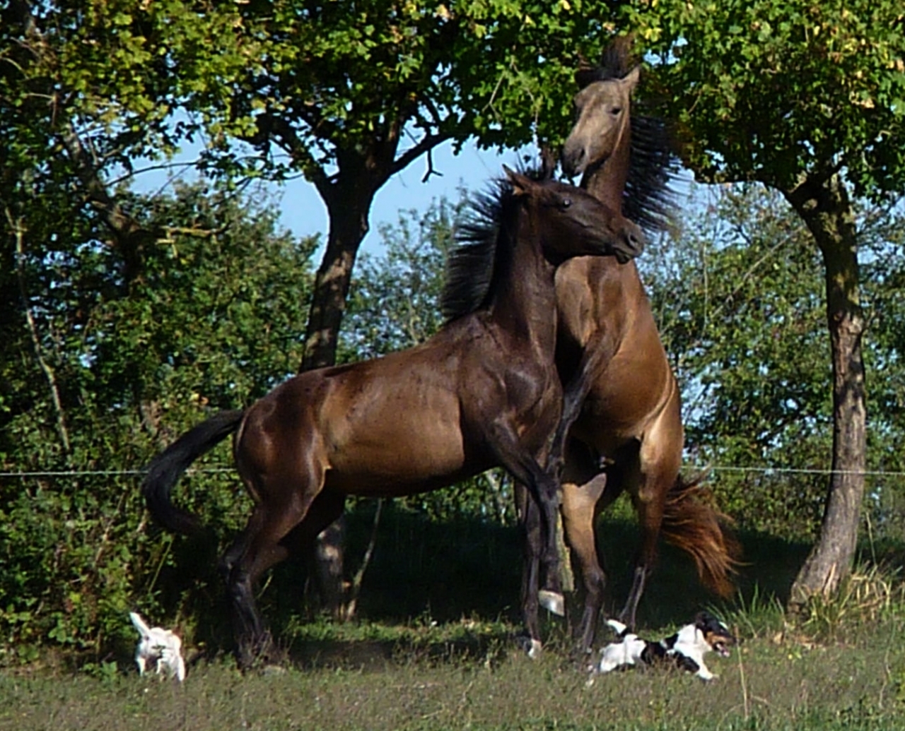 | Dire merci | loarghann non, apparemment on est obligé de loger les chevaux sur place (200€ les 3 jours, ça pique )ice queen Nous sommes allés au Haras de la Gesse pour prendre un cours pour préparer la finale des MCI ![]() A notre retour, j'apprends par téléphone que Lebrera est en coliques....depuis 5 jours qu'elle est en box (je les ramenais le soir-même au pré), elle a du se gaver de paille et de foin, et a fini par faire une colique, heureusement sans gravité, mais très impressionnante au début apparemment.... du coup, après la calmagine, le personnel du club l'avait lachée dans le rond de longe avec Falcon....qui s'en est donné à coeur joie! |