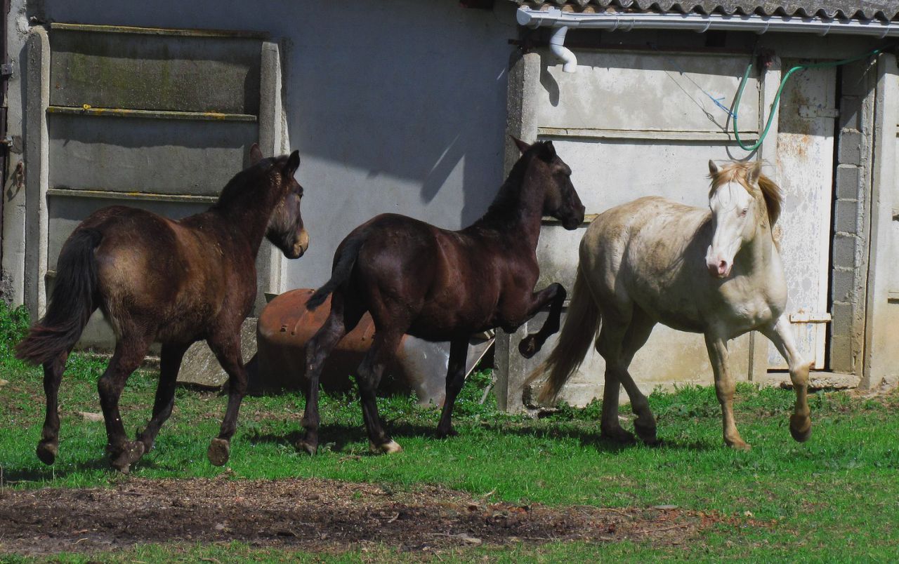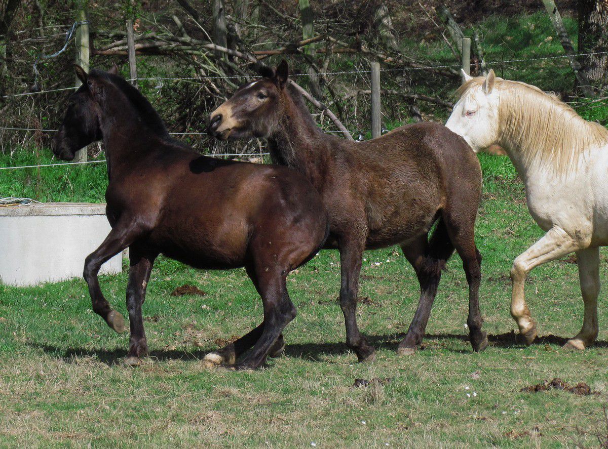 | Dire merci | Ayé, des photos fraiches du jour ![]() Bon, commençons par la seule photo potable de la veille: poulichon sur la palette, exercice qu'il maitrise désormais plutôt bien, vu qu'il y grimpe tout seul Pour les 4 pieds c'en est aux balbutiements, mais ça vient (là il était en train de descendre, forcément, si je recule pour prendre la photo, il veut me suivre )![]() Et les photos du jour: après un nouvel essai de montée dans le camion (fructueux, poulichon y a mangé la moitié de sa ration, tranquillement, et est monté assez facilement, il a suffit de lui pousser un peu les fesses...rien à voir avec le 5 janvier dernier ), on a fait 2-3 petites révisions, comme par exemple la bâche, totalement acquise:![]() le trot en longe (pas de photo) et même en liberté (longe autour du cou) (peut-être photo de PE?) avant de regagner le pré et retrouver ses potes, petite séance photo seul dans un paddock en herbe toute la grâce du poulain ...photo très Vicky-esque par ailleurs ![]() ![]() et enfin, les potes ![]() ![]() ![]() et une petite photo extraite d'une vidéo (à venir), Poulichon se préparant à envoyer les postérieurs ![]() oilà ![]() ce soir, résultat copro, peut-être vidéos des galopades au pré et jeux entre mâles, et, dans (...) jours, les photos de PE ![]() |