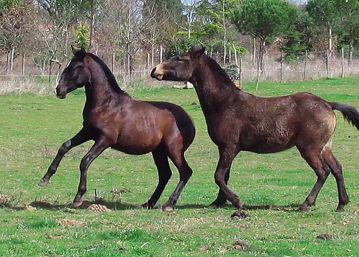 | Dire merci | Bonjour bonjour! Commençons ce topic-fleuve par une petite présentation des protagonistes ![]() Akanto, dit « poulichon », jeune étalon PRE noir né le 19 mars 2010 d’Ebanisto 6 et Nocturna XIII, à l’élevage Rozière. Un "pti jeune" aux multiples adjectifs, dont on retiendra particulièrement celui-ci : «calme ». Posé, réfléchi, c’est un élève modèle, quoique très gourmand. A côté de nos sorties "loisir" (il est labellisé Elite Loisir junior et monté, et on commence le TREC), Akanto commence le dressage de façon un peu plus sérieuse avec un cavalier, et commence à avoir des résultats très encourageants On fera d'ailleurs la finale européenne des MCI en novembre prochain en Belgique! Mais le gros de son emploi du temps, c'est de vivre au pré avec ses juments, une vraie vie de famille... ![]() Ma première jument, c'est Lebrera XXXVI, jument PRE PP née en 1999. Je la connaissais avant Akanto, j'ai failli réserver son poulain 2010, mais les aléas de la vie on fait que.... et puis la chance aidant, j'ai pu la racheter en 2012 car je rêvais d'un poulain d'elle, qui plus-est avec Akanto! Elle est la mère d'Eléio et de Falcon d'Auréa (né le 7 juillet 2015). ![]() Et le petit Falcon, surnommé Bambi ![]() ![]() Vient ensuite Eléa, jument de race Schwarzwalder née en 2007, une race de demi traits allemande (Forêt Noire). Eléa m'a été confiée par sa propriétaire pour une durée indéfinie, c'est une splendide jument, championne de M&A dans sa race et mère de champions également elle est très douce et caline Elle est la mère d'Elégie d'Auréa, née le 13 mai 2014, et de Faline d'Auréa, née le 3 juillet 2015. ![]() La petite Faline, à l'image de sa robe....elle a le feu! ![]() Enfin, Nikita (PRE baie, demi soeur de Lebrera par le père) et sa fille Féérie nous ont rejoint au cours de l'été, pour un poulain avec Akanto en juin 2016 ![]() Sans oublier Vicky, qui nous a quitté brutalement le 12 avril 2015.... Mon premier cheval, que j'ai rencontré 18 ans auparavant, dont j'ai rêvé d'être la propriétaire pendant 8 ans, et ce rêve s'est réalisé, durant les 8 dernières années, il m'a suivi à Lyon, en Alsace, et à Toulouse, où il a fini ses jours, entourés de sa "famille", toujours beau, toujours fier, un cheval exceptionnel, un sacré carafon mais incroyablement gentil et tolérant.... mon « vieux beau » qui me manque.... Lien ![]() Voici donc les chevaux qui composent mon jeune élevage, l'élevage d'Auréa.... à suivre au fil des pages... Lien Message édité le 23/12/15 à 11:57 Message édité le 01/01/16 à 22:03 |