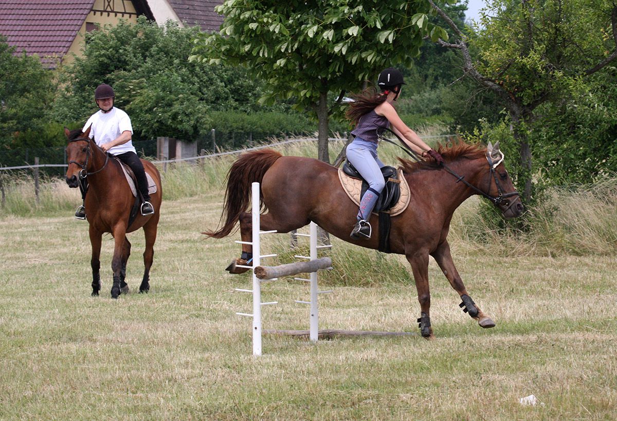 | Dire merci | allez, c'est parti pour une petite série sur Vicky ![]() mon chéri était de retour en Alsace pour le week end, et il est passé voir mes chevaux (comment ça il est trop? )Ce jour-là, c'était séance d'obstacle pour ma soeur et Nadja, et mon pôpa sur Vicky. ATTENTION: il est strictement INTERDIT de faire la moindre réflexion sur la façon de monter de mon pôpa, c'est un privilège qu'on se garde précieusement avec ma soeur (il a appris à monter il y a 40 ans et n'a quasiment pas remonté depuis, pour la petite histoire )Alors, "comment se foutre gentiment de la tronche d'un humain en 4 leçons", par Vicky étape 1: lui faire croire qu'on va bosser ![]() étape 2: s'arrêter subrepticement dans un bosquet pour...hé m***, pris en flag! ![]() étape 3: passer son temps à regarder LES AUTRES sauter (moins fatiguant) ![]() étape 4: balader un peu l'humain, quand même, le minimum syndical, quoi... ![]() et là, triste constat: l'a repris son gros biiiiide ![]() |