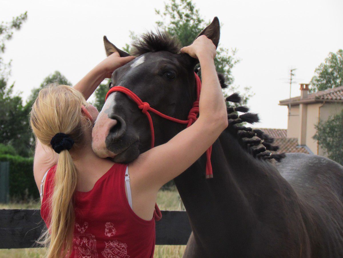 | Dire merci | Bonjour bonjour! Commençons ce topic-fleuve par une petite présentation des protagonistes ![]() Akanto, dit « poulichon », jeune étalon PRE noir né le 19 mars 2010 d’Ebanisto 6 et Nocturna XIII, à l’élevage Rozière. Un "pti jeune" aux multiples adjectifs, dont on retiendra particulièrement celui-ci : «calme ». Posé, réfléchi, c’est un élève modèle, quoique très gourmand. A côté de nos sorties "loisir" (il est labellisé Elite Loisir junior et monté, et on commence le TREC), Akanto commence le dressage de façon un peu plus sérieuse avec un cavalier, et commence à avoir des résultats très encourageants On fera d'ailleurs la finale européenne des MCI en novembre prochain en Belgique! Mais le gros de son emploi du temps, c'est de vivre au pré avec ses juments, une vraie vie de famille... ![]() Ma première jument, c'est Lebrera XXXVI, jument PRE PP née en 1999. Je la connaissais avant Akanto, j'ai failli réserver son poulain 2010, mais les aléas de la vie on fait que.... et puis la chance aidant, j'ai pu la racheter en 2012 car je rêvais d'un poulain d'elle, qui plus-est avec Akanto! Elle est la mère d'Eléio et de Falcon d'Auréa (né le 7 juillet 2015). ![]() Et le petit Falcon, surnommé Bambi ![]() ![]() Vient ensuite Eléa, jument de race Schwarzwalder née en 2007, une race de demi traits allemande (Forêt Noire). Eléa m'a été confiée par sa propriétaire pour une durée indéfinie, c'est une splendide jument, championne de M&A dans sa race et mère de champions également elle est très douce et caline Elle est la mère d'Elégie d'Auréa, née le 13 mai 2014, et de Faline d'Auréa, née le 3 juillet 2015. ![]() La petite Faline, à l'image de sa robe....elle a le feu! ![]() Enfin, Nikita (PRE baie, demi soeur de Lebrera par le père) et sa fille Féérie nous ont rejoint au cours de l'été, pour un poulain avec Akanto en juin 2016 ![]() Sans oublier Vicky, qui nous a quitté brutalement le 12 avril 2015.... Mon premier cheval, que j'ai rencontré 18 ans auparavant, dont j'ai rêvé d'être la propriétaire pendant 8 ans, et ce rêve s'est réalisé, durant les 8 dernières années, il m'a suivi à Lyon, en Alsace, et à Toulouse, où il a fini ses jours, entourés de sa "famille", toujours beau, toujours fier, un cheval exceptionnel, un sacré carafon mais incroyablement gentil et tolérant.... mon « vieux beau » qui me manque.... Lien ![]() Voici donc les chevaux qui composent mon jeune élevage, l'élevage d'Auréa.... à suivre au fil des pages... Lien Message édité le 23/12/15 à 11:57 Message édité le 01/01/16 à 22:03 |