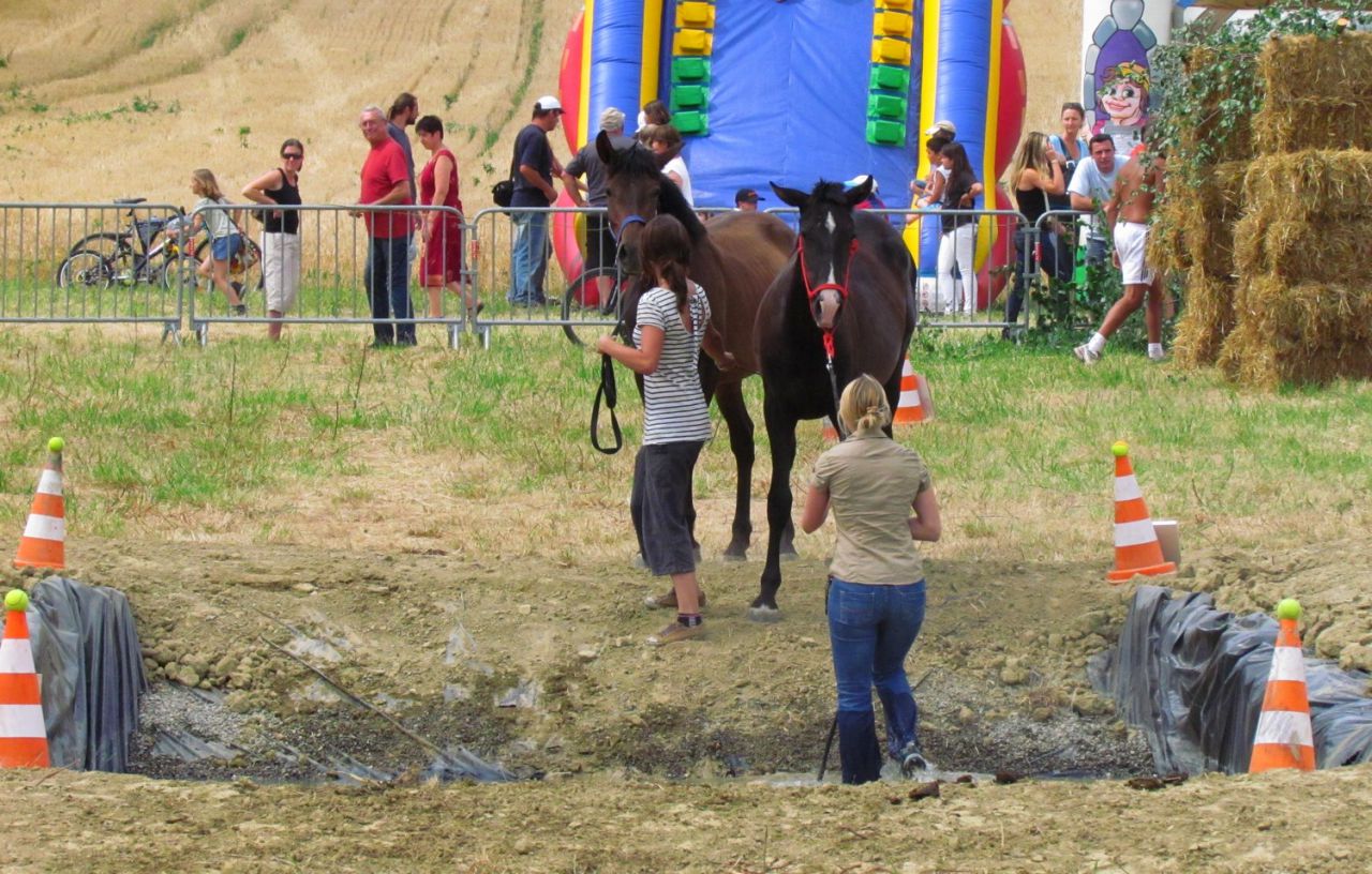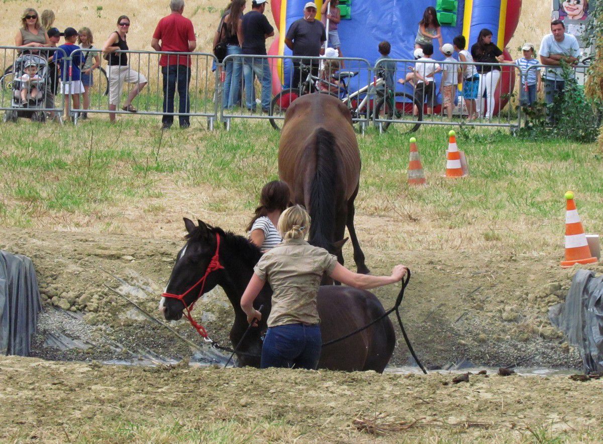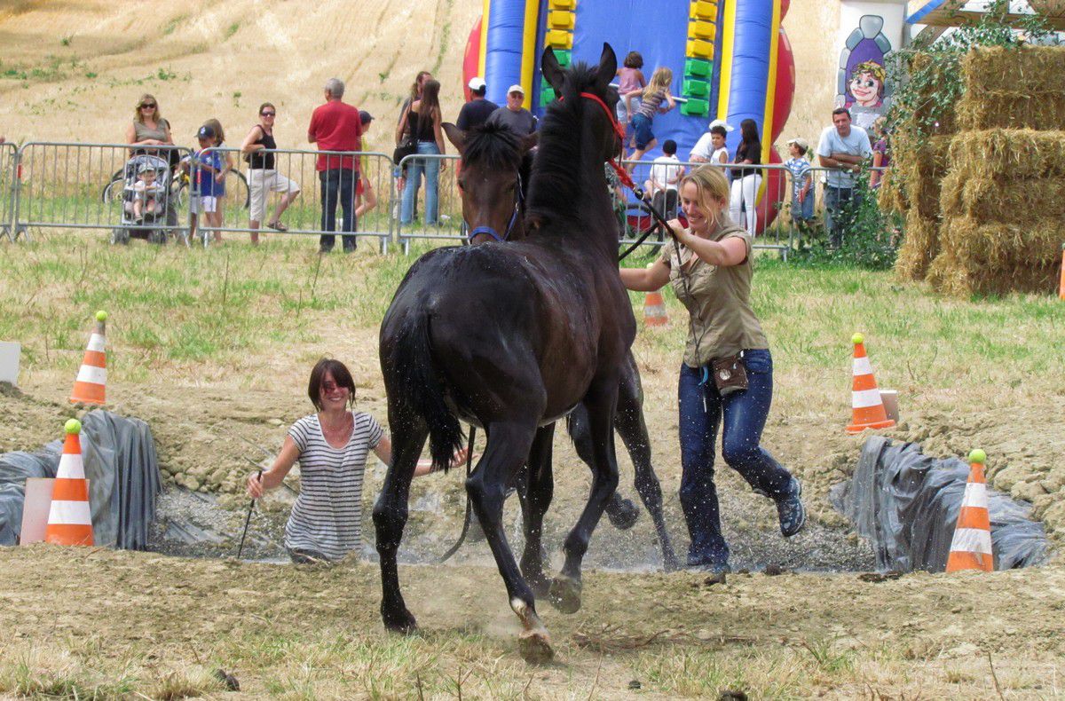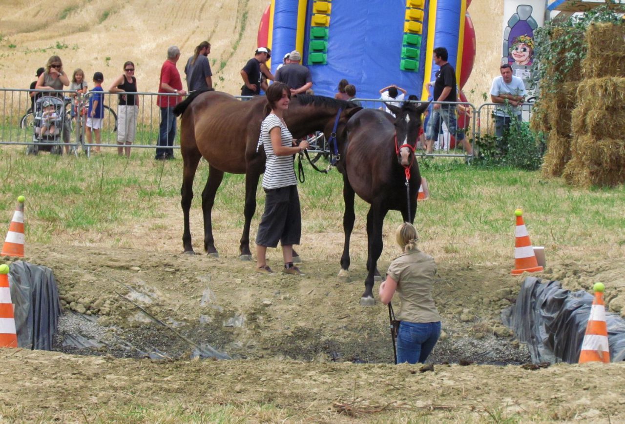 | Dire merci | 6- le fameux gué.... de l'eau presque jusqu'à la taille, on n'était pas tranquille quant à la descente...et les poulains non plus Poulichon et Mas: "heu, c'est quoi votre truc là???" ![]() Poulichon se met doucement en mode mulet, malgré les motivations "carottes" et la voix... alors on pousse un peu derrière ![]() ![]() et paf, un poulichon à l'eau! (j'étais déjà en train de remonter, c'est pourquoi je suis plus haute que lui) ![]() mais pas le temps de s'attarder dans l'eau, Mas nous rejoint en sautant dans l'eau, arrachant la longe des mains de Violette et poussant poulichon malgré lui vers la sortie ![]() On rattrape un poulain en liberté... ![]() et on se dirige vers la dernière épreuve ![]() ![]() 7- reculer dans un L. Bon point pour les poulains (même si j'ai oublié de faire déplacer les fesses de poulichon, oups ), ils se comportent très sagement, malgré les émotions d'il y a quelques secondes ![]() ![]() et le parcours est fini, on file vers la sortie ![]() |