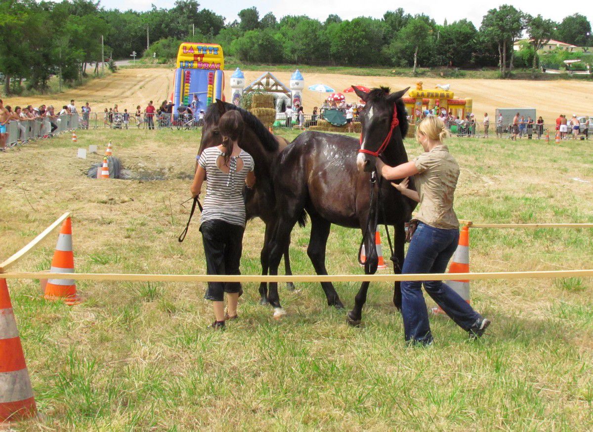 | Dire merci | Bon, je n'ai pas bcp de photos, parce que j'avais la batterie en train de se vider, et pour le début de notre parcours, mon APN a fait de drôles de blagues, donc vous aurez juste la fin ![]() Voici donc qq photos de l'aprèm "jeux équestres" organisée à Ste Foy de Peyrolières, où poulichon a participé, accompagné de son pote Mas USA Bon, tout d'abord, pour faire un bon parcours, faut déstresser poulichon au préalable. ![]() (comment ça j'en fais des tonnes? )Ensuite, il faut être patient...parce qu'on a bien du poireauter 3h avant de passer, et heureusement que les poulains se sont bien comportés! Et juste avant l'entracte, c'est enfin notre tour. Nous ne pourrons pas faire toutes les épreuves, ce parcours ayant été fait pour chevaux montés à la base (donc aller mettre des balles de tennis dans un trou à 2m50 de haut, pas trop possible ).Donc pour nous, les épreuves ont consisté à 1- passage de 2 flaques (nickel, après une légère hésitation pour poulichon) 2- se lancer entre meneuses des balles de tennis (facile pour des poulains habitués à ce qu'on fasse n'importe quoi à côté d'eux )3- passer sur une plaque en bois pour faire BIIIIP (et on remercie poulichon au passage qui ne s'est pas contenté d'un seul pied sur la plaque mais qui y a consciencieusement mis les 4, l'un après l'autre biiiip biiiip biiiip )4- passer sous des branches basses (à l'aise blaise )5- un truc bizarre: fallait mettre le cheval dans un cercle et tourner autour, le cheval devant nous suivre sans sortir du cercle (nous à l'extérieur) et sans toucher le cheval. Merci petite carotte, poulichon a géré |
