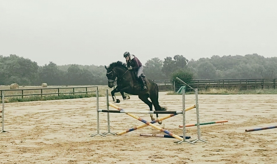 | Dire merci | Il fait beau, il fait chaud et aujourd'hui, nous avons sauté ! Ça m'a pris comme une envie de pisser. Pas envie de dresser( surtout que j'aime pas monter avec quelqu'un ) et malgré la pluie tenace, il y avait un petit obstacle isolé qui me faisait de l'oeil ![]() J'ai monté un autre obstacle histoire de bosser mes courbes , et roule ! Comme à son habitude, Espoir tourne un œil curieux vers sa selle une fois sur le dos, en mode " tiens on va pas faire des trucs chiants aujourd'hui ! " Et une fois dans la carrière , Espoir tournicotte autour des 2 obstacles, tout content !! On passe les croix ... Espoir replie pas trop les crayons ,pourquoi faire tant d'efforts? Le vertical est monté, Espoir s'applique....une fois...bah oui ,on était sur 70 cm L'oxer est monté également, ce qui amuse bcp Les, que je garde armé à l'abord et qui propose de superbes sauts ( mamie a du mal à suivre et se prend un taxi )Pour une reprise , on finit malgré tout sur 90 cm, avec un gentil oxer pas trop large mais qui permet à Espoir d'étirer son petit dos ![]() Ses abords sont nettement meilleurs maintenant que le galop sur le plat est plus équilibré et rassemblé. Avant il me collait plein de petits pieds alors qu'aujourd'hui ,il n'y a eu qu'un couac ( exception faite du tout premier saut qui était en mode " faut sauter là ?? " De notre part ) Comme le mariage est passé , j'ai plus d'excuse pour pas sauter régulièrement, surtout qu'on a un chouette pro à disposition aux écuries ![]() |