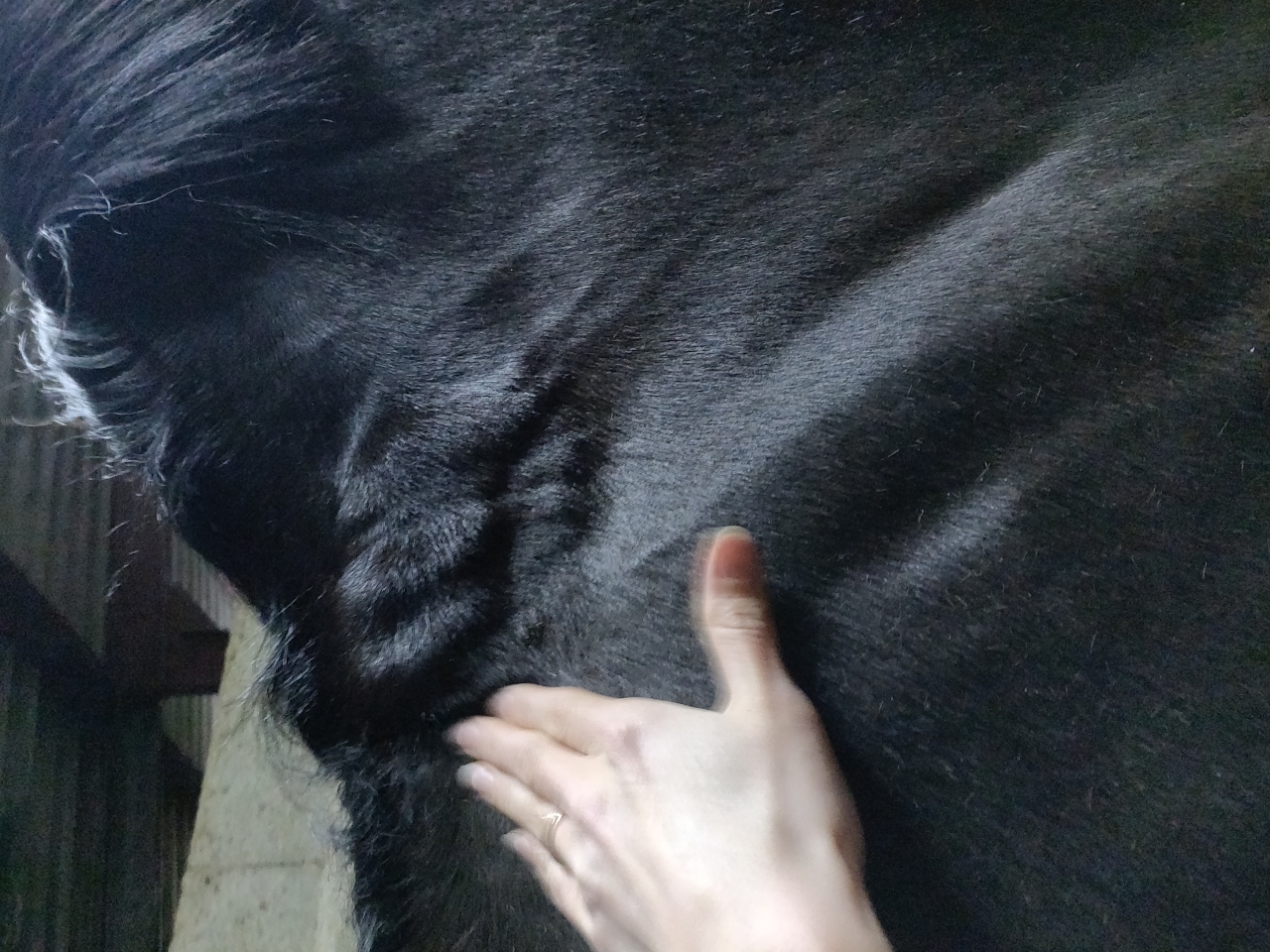 Poulain limite frustré de rentrer si rapidement, pour une fois il m'a attendu pour une friandise au retour du paddock. D'habitude, il part en trottant pour se rouler puis revient réclamer sa ration .