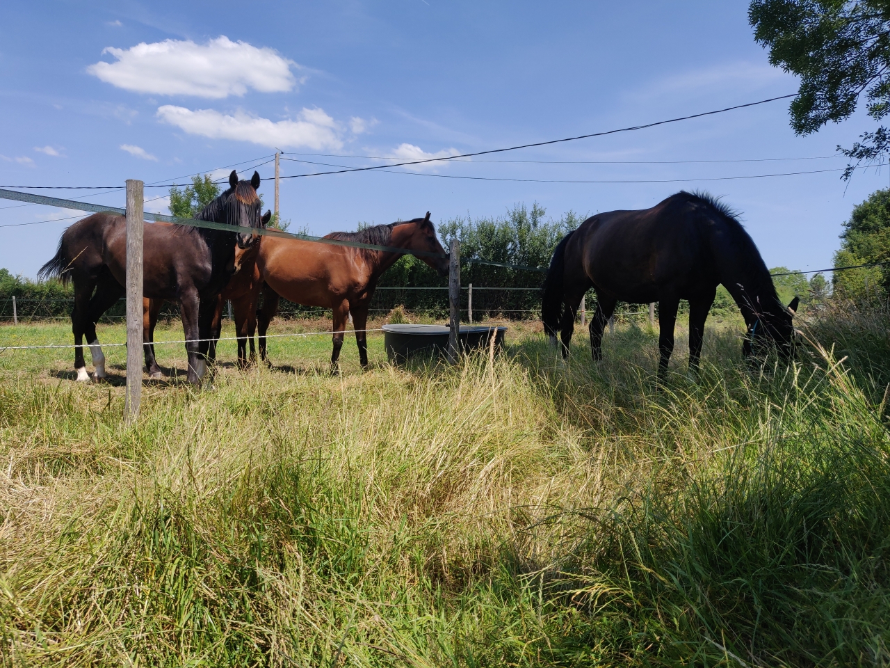 | Dire merci | ![]() Ça c'est trop cool Un cheval frais douché qui broute a l'ombre , avec le petit frère en compagnie. Petit frère qui a hérité des franges du grand frère car envahi de mouches et pas serein du tout a mon arrivée. En gros , t'arrives, tu lui mets les franges sur le pif en toute liberté, là où Sa Majesté pigne en levant la tête. Poulain pratique ! |