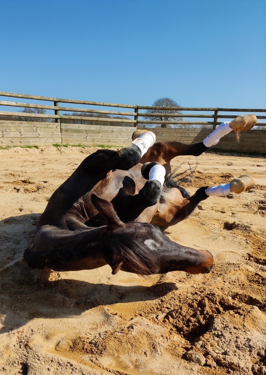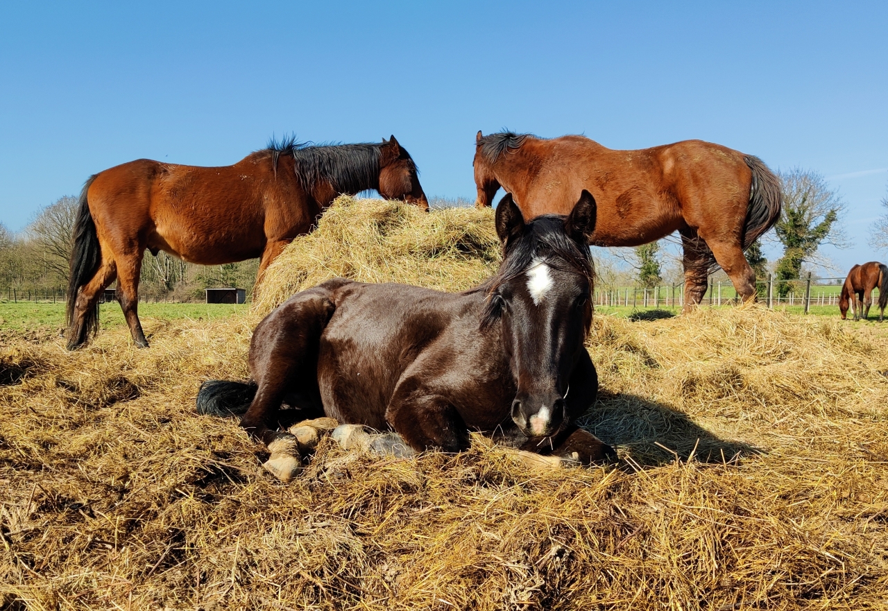 | Dire merci | Sherpa s'était fait peur avec le filet du flymask, il avait du se prendre des bourres en le coinçant dans la clôture je pense, j'ai du le couper. Puis j'ai viré le flymask, parce que ça ne lui réussissait pas non plus en fait. (quand je lui enlevais, il pétait un câble et galopait comme un couillon sans que je puisse l'attraper... J'ai l'impression que c'était le changement brutal de luminosité qui le paniquait. Pourtant quand je le lui mettais, il ne disait rien, mais il n'a jamais mis le nez dedans comme Belline... ou comme quand je le bride, donc sans doute qu'il n'aimait pas ça, au delà de la trouille que ça lui collait quand je lui enlevais). |