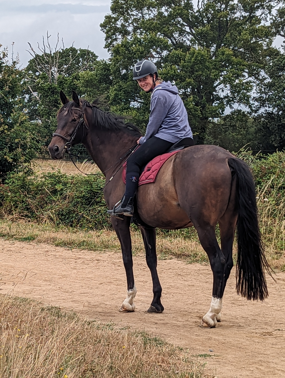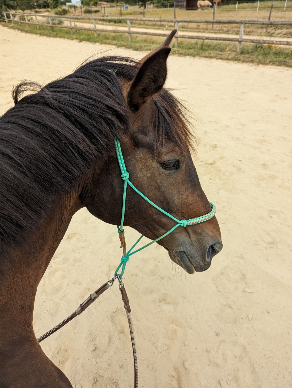| Dire merci | Ça dépend de ce que je fais, en extérieur ( le tour des écuries hein...) ou comme aujourd'hui pour la détente , c'est souvent a une main par flemme , en tournant aux jambes et poids du corps , en rajoutant la rêne d'appui au besoin. Et si c'est plus travail, c'est un poil plus en rêne d'ouverture et avec les 2 mains, mais la tentation d'ajuster est grande sauf que c'est pas pertinent ! Le but ça reste quand même d'avoir la mobilisation en touchant le moins aux rênes possible . Il me fait marrer car il faut le trainer sur les premières transitions pas - galop avec une embouchure,mais il part toujours content en licol |