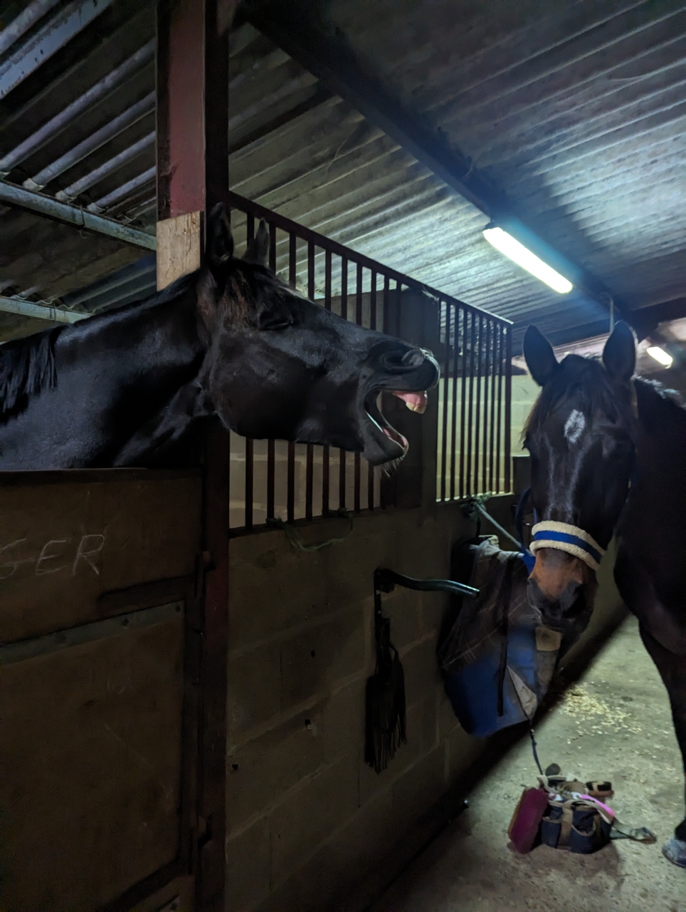 | Dire merci | Le poulain a tenté de faire sciemment une bêtise monté,une première ! J'ai nommé : essayer de paddocker. Problème , cette tanche prévient 20 mètres avant en collant aux aides et en débrayant pas du tout discrètement. Du coup il s'est retrouvé a bosser plus fort devant l'entrée et faire des pauses au fond. Et faire des transitions descendantes vers la sortie/ transitions montantes vers le fond. Il a raison d'essayer,il est pas con ce machin ! Du coup pour éviter l'agression par le stick , il est codé a la voix avec " hip hip hip " très aigu avant de coup de semonce. C'est drôle,il rentre le cul et ziouuup il file droit ! M'enfin la réponse aux jambes est un peu a géométrie variable en ce moment ....même durant la séance ![]() Le gros a vu le dentiste, son grand ami. Non je déconne ,il a passé la consultation a croquer la râpe en fond de bouche, roter, secouer la tête sur la fin . Une gentille purge car ça s'arrête là mais pénible quand même pour le gars. |