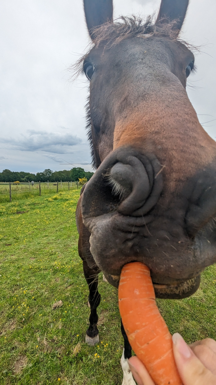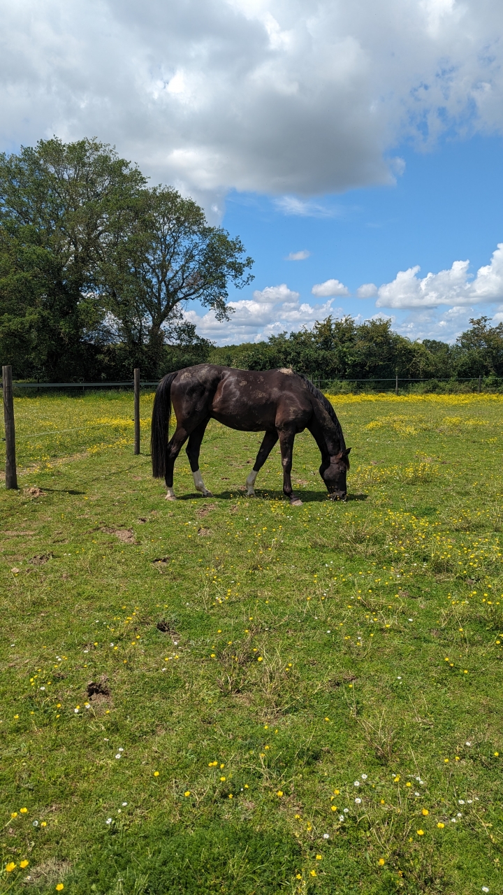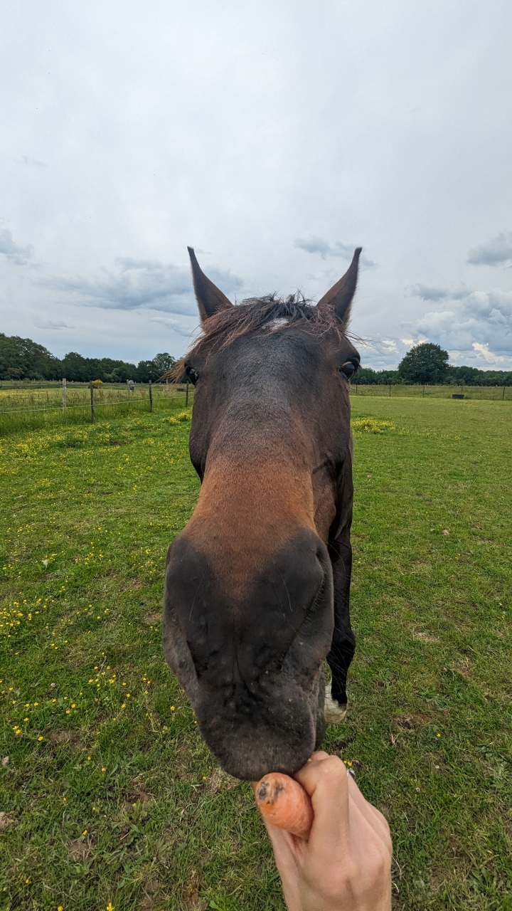 | Dire merci | En vrai faut qu'il arrête d'être aussi mignon , c'est un coup a lui laisser tout faire , même s'il fait rien ![]() ( Et c'est comme ça qu'on se retrouve un jour avec une chatte qui nous toise telle une princesse quand elle refuse de descendre de la table du salon, même si on tape dans les mains. True story) Du coup , on a fait une séance super sympa sur la grosse moitié de la séance, puis une cavalière est venue s'abriter de la pluie dans le manège le temps de marcher. Je lui ai demandé si je pouvais faire évoluer Jagger autour d'elle aux 3 allures , histoire de profiter un peu d'avoir quelqu'un d'autre . Déjà , aucun stress, il s'est pas perché là haut . Niveau concentration,ya eu mieux, ya eu pire, un peu de mal a s'écarter,une direction un peu hasardeuse par moment car il irait bien le rejoindre. Et c'est la première fois que j'ose galoper avec un copain, trop bien! Et après , le couple est sorti, est passé derrière puis sur le côté du manège sans que ça emeuve trop le petit ! Très contente de cette séance en 2 temps !! Et Sa Majesté... J'étais en manque de jus pour le gratter sur le plat , donc chuis partie marcher et trotter renes longues sur la piste en cherchant une quelconque inspiration de séance . Puis Espoir me demande a bifurquer vers la grande allée en herbe ( bah tien,il sait ce qu'il veut lui !) je lui dis ok poto, mais doucement. Donc doucement mais sûrement il a pris un grand galop, sauf que j'étais toujours rênes à la couture il était content ! On part sur une autre boucle, Les me redemande le galop , sauf qu'il y avait d'énormes poussées de végétaux dont des grosses fleurs blanches . Cette nounouille s'eclatait a les sautiller , moi en selle de dressage, je me marrais tellement c'était rigolo Et après on a fait des bouts vite parce que bon...ça fait du bien a tout le monde de se décrasser Il a fini en écume mais content ! ![]() |