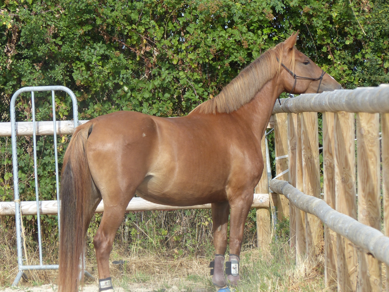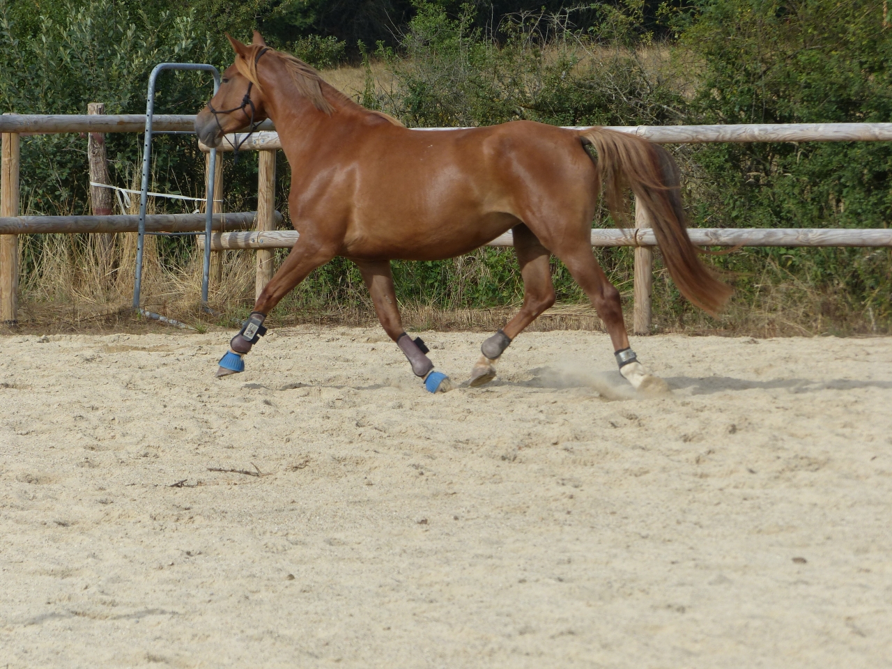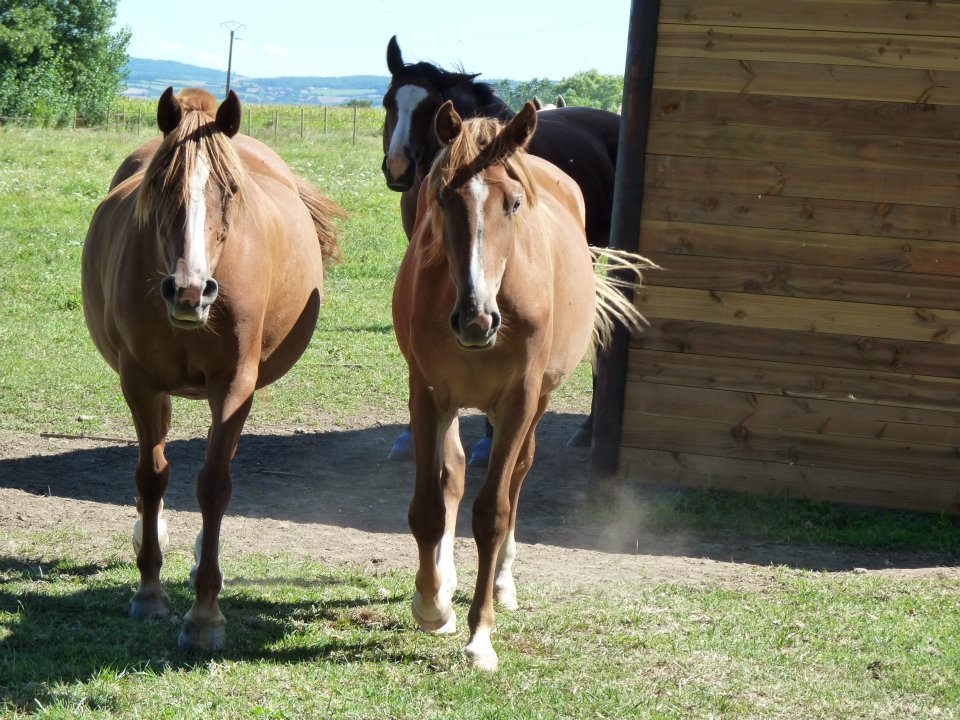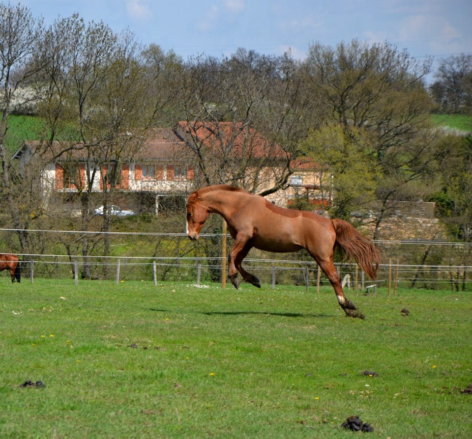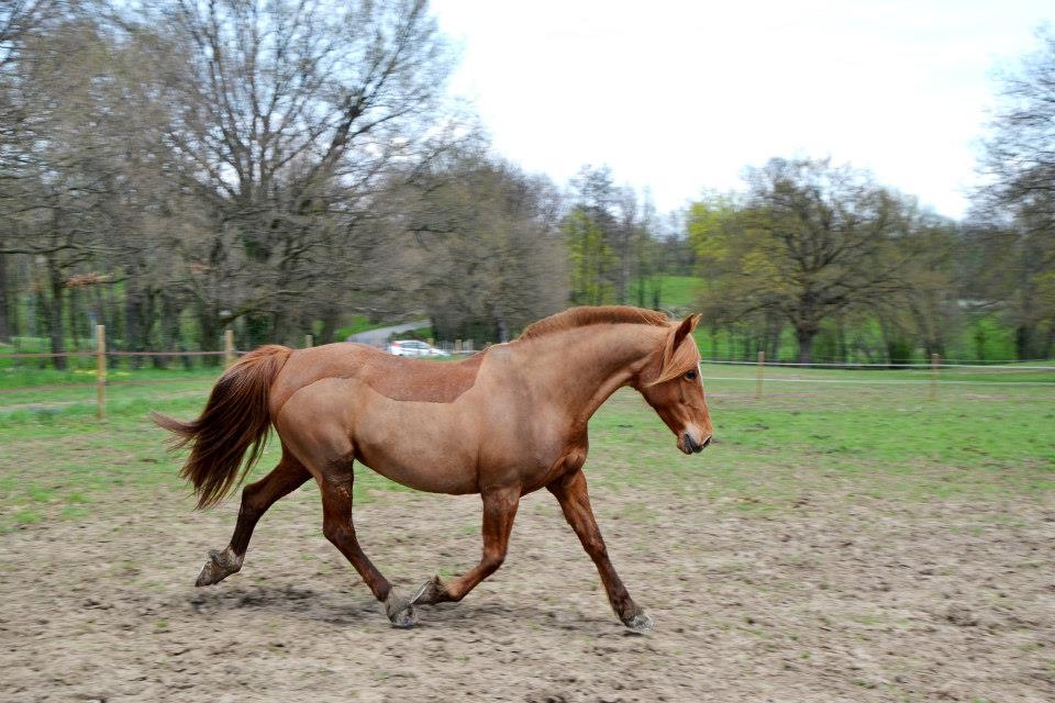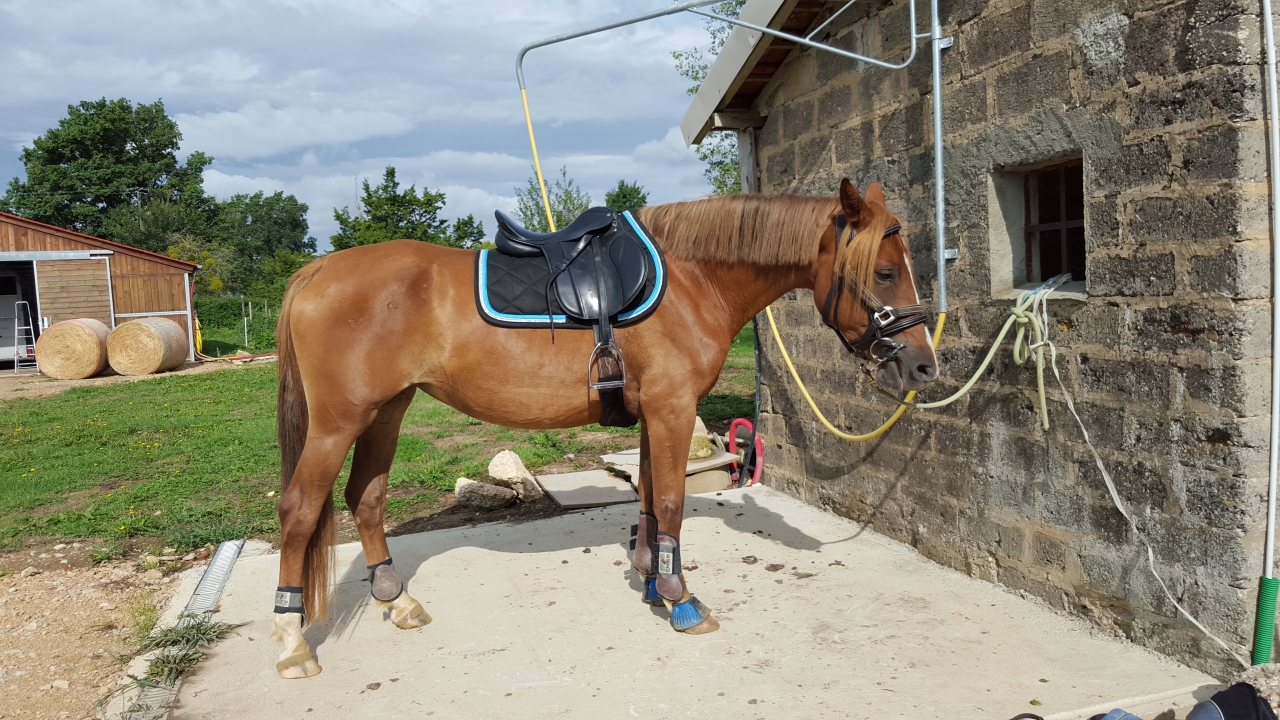 Non je ne l'ai pas vendu car elle reste LA jument de ma vie j'en reste persuadée elle me connait par coeur et est la seule qui arrive à entretenir cette relation si exceptionnelle que nous avons toutes les deux. Même si j'aime j'adore mes deux autres loustics nous n'avons pas la même relation c'est assez indescriptible. En juillet 2014, Pampa à donc pris ses nouveau quartiers et rejoint sa fille chez mes beaux parents en Bourgogne. Je continuais les balades à gogo jusqu'à ce que la colloc cob normand décide de lui faire une jolie entaille au dessus du boulet postérieur droit qui s'est transformé en suros. De la j'ai arrêté de la monter pendant 1 an et recommence les ballade depuis début juillet uniquement. C'est vraiment ce qu'elle aime faire et je me suis aperçu qu'en la laissant au pré et en me contentant de la brosser toutes les semaines madame s'ennuyait vraiment et depuis son retour en balade elle est au taquet