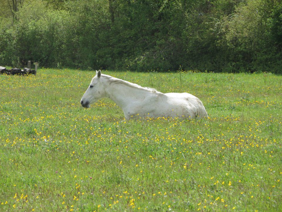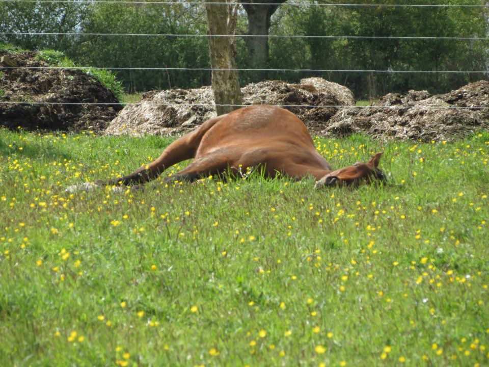 | Dire merci | Vendredi, séance pourri de chez pourri. En selle dans la carrière entre 2 averses, des flaques d'eau partout. Contrairement à il y a quelques jours, Lasco passe maintenant facilement dans les flaques aux 3 allures, sans ralentir ou hésiter. Mais il se contracte pas mal. Donc le but de ma séance, tout bête, chercher la décontraction. Au pas, ok. Au trot, bof. Mais alors au galop... Je me fais baloter dans tous les sens, il n'est pas cadensé, il fuit ou s'appui sur le mors... Ca ne servait à rien de bosser cette allure, je me suis contentée du trot. De toute façon, depuis quelques temps, je ne trouve plus ma place sur son dos. Je ne le trouve vraiment pas top, il se contracte pas mal. Je finis sur un truc pas trop mal où l'attitude était vraiment mieux et on arrête là. Aucun intérêt à insister. Dimanche, je suis arrivée à l'heure de la sieste! Tout le monde dormait au pré. La nouvelle copine (l'autre, trop grasse a été mise dans une pature moins riche) ![]() Le copain ![]() Et Lasco! ![]() Le temps que je m'approche un peu, il s'était complètement affalé! ![]() ![]() ![]() J'ai pu en profiter pour faire pleins de calins! ![]() ![]() ![]() ![]() ![]() ![]() |