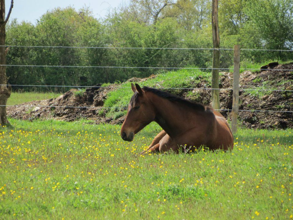 | Dire merci | Carrément! Et j'ai oublié de raconter; hier, Lasco était tranquille à l'attache pendant que je discutais. Je pense que le vent et la pluie qu'on a en ce moment les fatigues pas mal. En allant le chercher, c'était vraiment de grosses rafales. Et il a profité du moment de calme aux écuries pour se reposer... Sauf qu'il était tellement naze... Je le voyais fermer les yeux et baisser la tête petit à petit... jusqu'à envoyer de grands coup de tête en l'air comme pour se réveiller (comme nous on ferait en secouant la tête). Pauv' 'tit loup! |