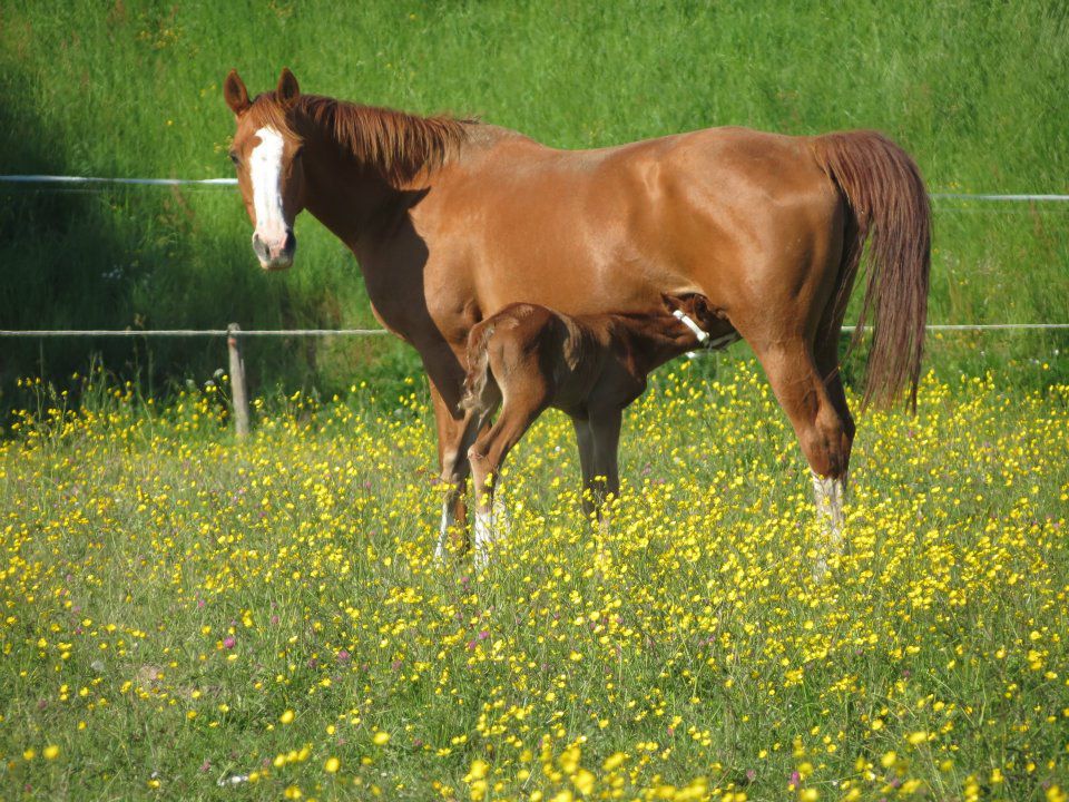 | Dire merci | Sur le cul? Du fait qu'il est déjà un licol? Il a du l'avoir sur le nez le 2ème jour. La journée et le soir la gérante lui enlève. Je ne sais pas vraiment pourquoi si tôt, mais au moins, ça lui fait 2 petites manipulations par jour et ça va finir par devenir tout naturel pour lui. Ca n'a pas l'air de le traumatiser! Après, quand la maman est sorti, on touche pas au poulain. Il l'a suit de très près encore. J'ai vu des photos de ce week end ou la mère a été emmené aux écuries pour un pansage. Il va avoir vu pleins de choses lui! |