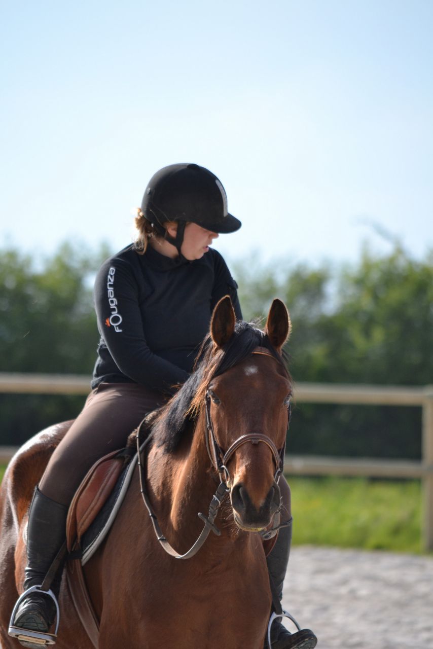 | Dire merci | Vendredi, ma DP était là. Et elle m'a donné un véritable cours. Un carré de 20m*20, délimité par des barres au sol. Bossé la mise sur la main, la tension dans le dos et surtout, le fait que le cheval s'enroule sur ma jambe interne. En gros, extra, même si le me suis fait traiter de galop 2 , à cause d'une transition plus que pourri. Franchement, entre les conseils de Gégé et le petit cours de ma DP, je sens vraiment un changement sur Lasco en ce moment. Il regarde moins à droite, à gauche, bien plus concentré. Les séances sont du coup assez courte, entre 25 et 40 minutes, mais il reste tout le long avec moi et ça, c'est hyper agréable. Photos d'une copine... arrivée en fin de séance! ![]() ![]() ![]() ![]() ![]() Dimanche, seule au club, Lasco pas trop mal du tout. J'ai refait un peu la même chose que vendredi, mais en utilisant toute la carrière. Moins bien qu'avec ma DP pour me dire quand agir, mais pas trop mal si je prends en compte que j'étais seule. Une vidéo de la séance. Non seulement le montage est pourri, j'ai vraiment mal cadré l'APN mais en plus, quand j'ai enregistré le montage, j'ai merdouillé pour la qualité, elle est pourri de chez pourri! Je ne sais pas si vous allez y voir quelque chose! ![]() Message édité le 29/04/13 à 09:14 |