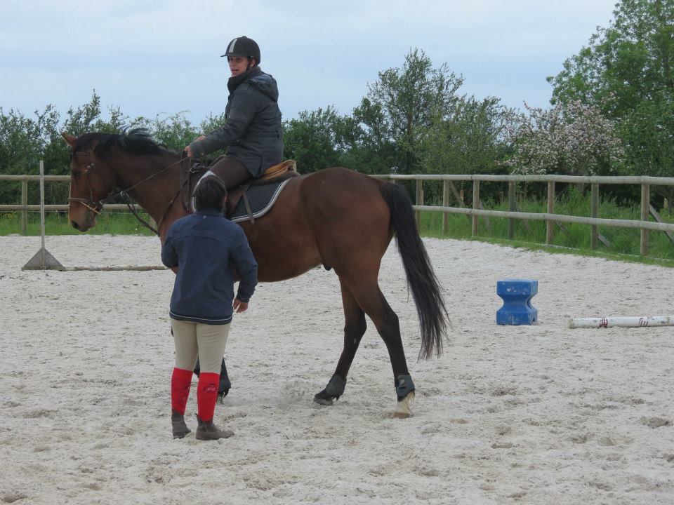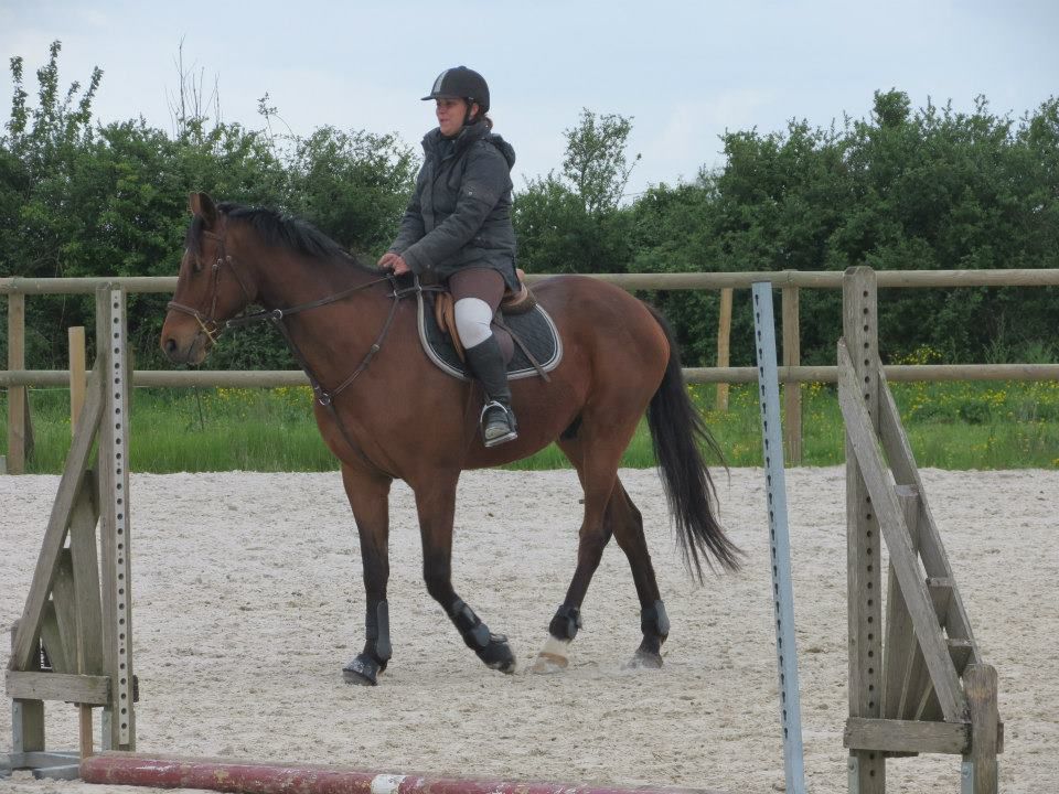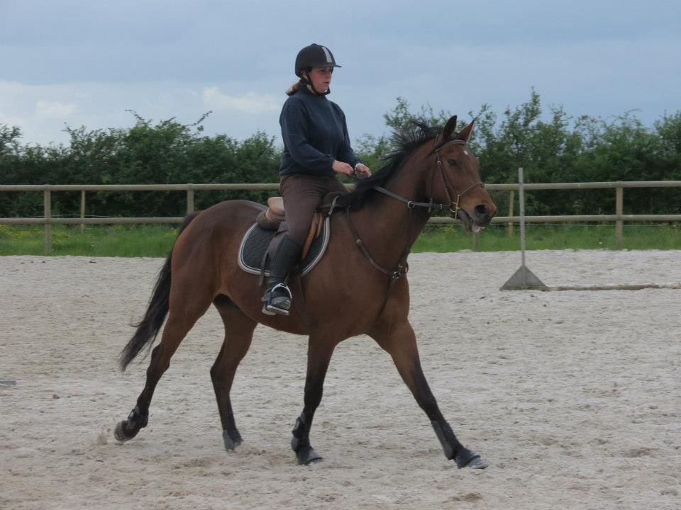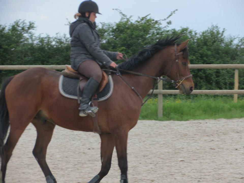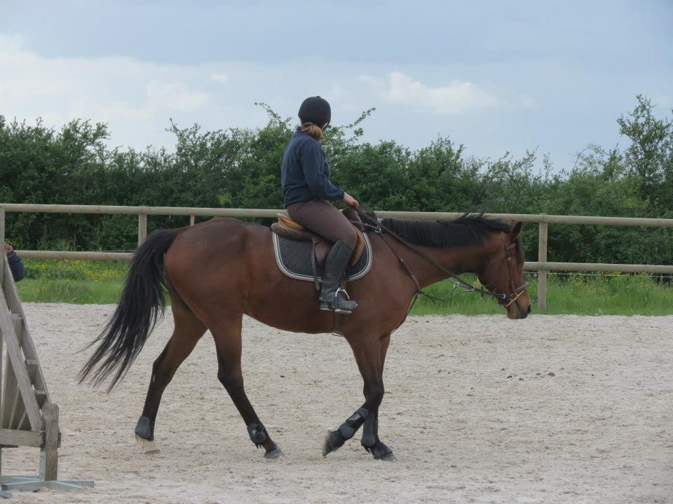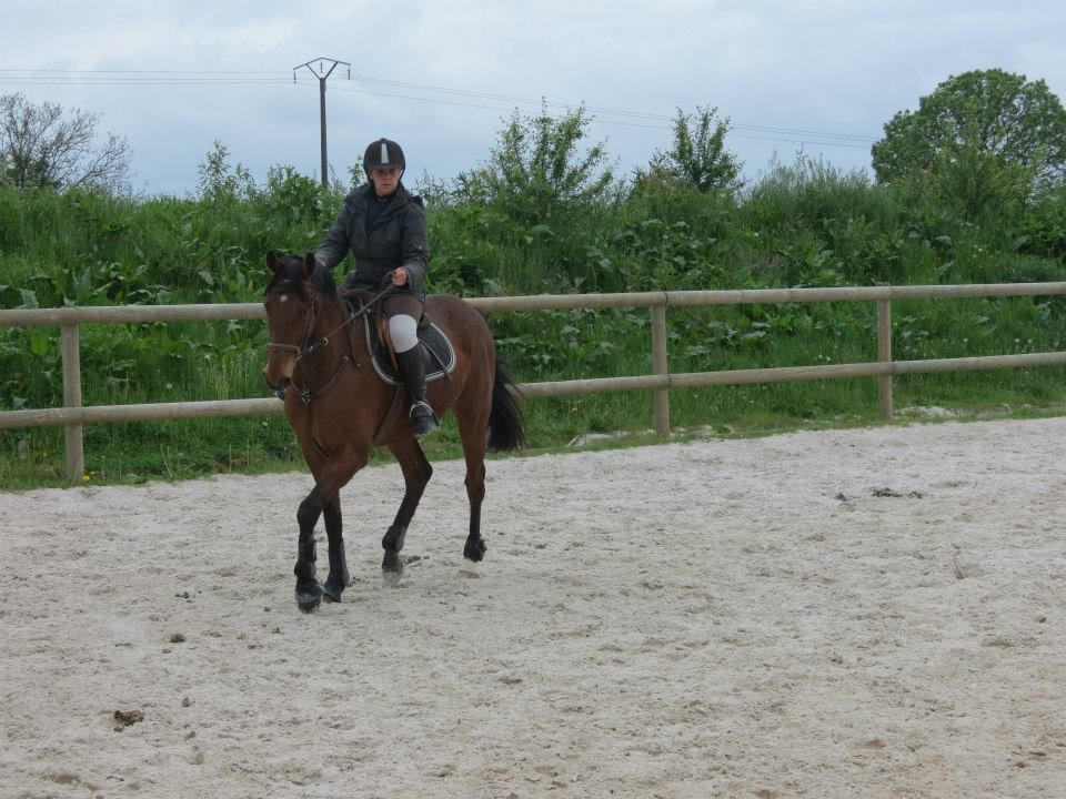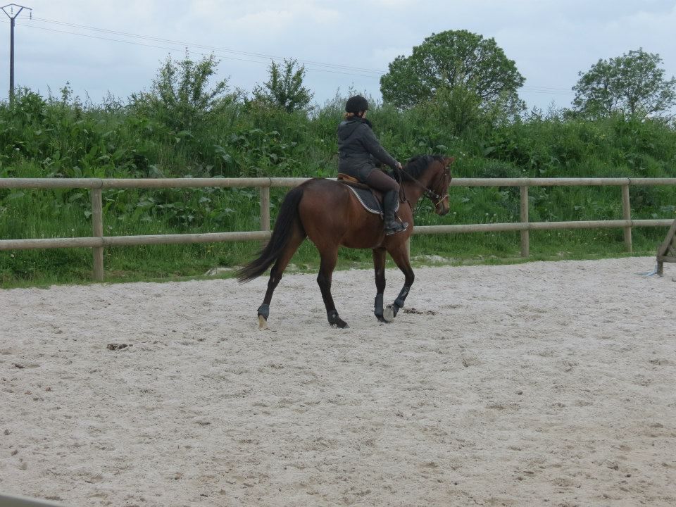 | Dire merci | Des nouvelles. Mercredi, temps de chiotes. J'ai récupéré Lasco trempé au pré. Du coup, dos sensible et chatouilleux. J'étais avec ma DP, on montait toutes les 2. On a opté pour les RA histoire qu'il ne se mette pas à la retourne avec son dos sensible et qu'il s'échauffe au mieux. C'est ma DP qui a commencé et elle en a chié. Lasco n'a pas été très coopératif! Mais il a fini par donner... quoi que même quand il se posait enfin, 3-4 foulées plus loin, il tentait de truander.A mon tour, Lasco est très très sensible de la position de jambes, j'en profite pour bosser sur un cercle sur hanche en dehors, hanche en dedans. Une super réponse mais du mal à l'avoir droit sur le cercle. Ma DP a pointé un gros défaut qui détériore mon travail à main droite, j'ai la main droite tout le temps en arrière de l'autre, du coup, ça tire sur la bouche. Etrangement, pas le soucis à main gauche. Je pense que j'ai naturellement le dos de travers et que ça s'accentue à droite. Il a fallu que je fasse un effort monstrueux dans mon dos pour être le plus droite possible et avancer cette main... dur dur. Le reste de la semaine, pas possible d'aller m'occuper de Lasco, la belle famille était là et j'ai pas eu le temps de m'échapper. Dimanche, beau temps et chaleur. Programme du jour, parcours de barre au sol. Tout simple, 2 lignes de 5 et 6 foulées dans chacune des longueurs, 1 isolé dans la largeur et 1 autre dans la diagonale (que je prenais après une des barres de la ligne pour faire une ligne brisée). Je teste un nouveau mors en ce moment: aiguille double brisure en cuivre. Il tirait trop sur les barres au sol et en saut avec ma DP avec le mors droit en résine. Donc là, on tente celui là sur plusieurs séance et il me plait plutôt bien. Donc la séance, hyper contente, je fesais ce que je voulais de Lasco. 1 foulée de plus ou de moins dans les lignes, des transitions au trot pour changer de pieds tranquillement... Il était super content de faire l'exo mais pas exité. Il est resté super cadensé tout le long, bref, trop agréable, je me suis bien fait plaisir! ![]() |