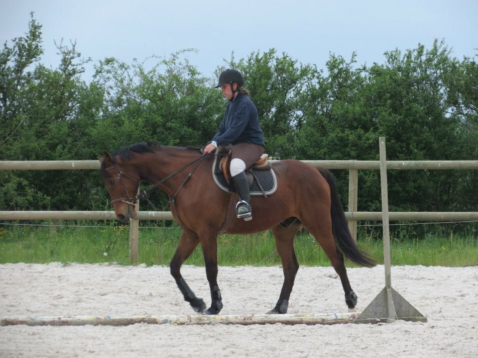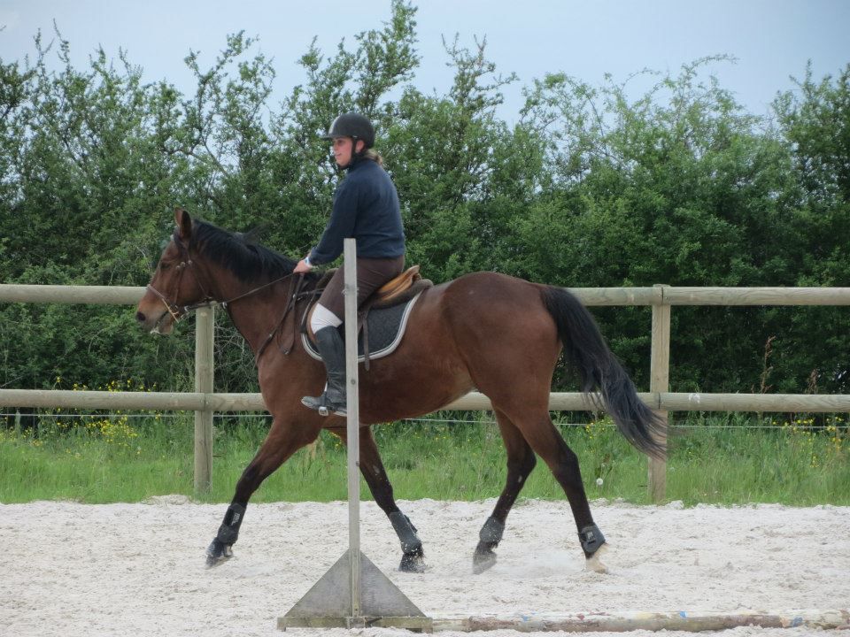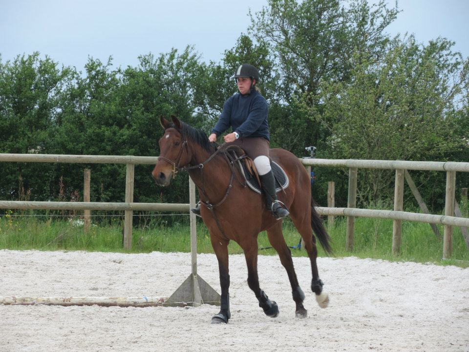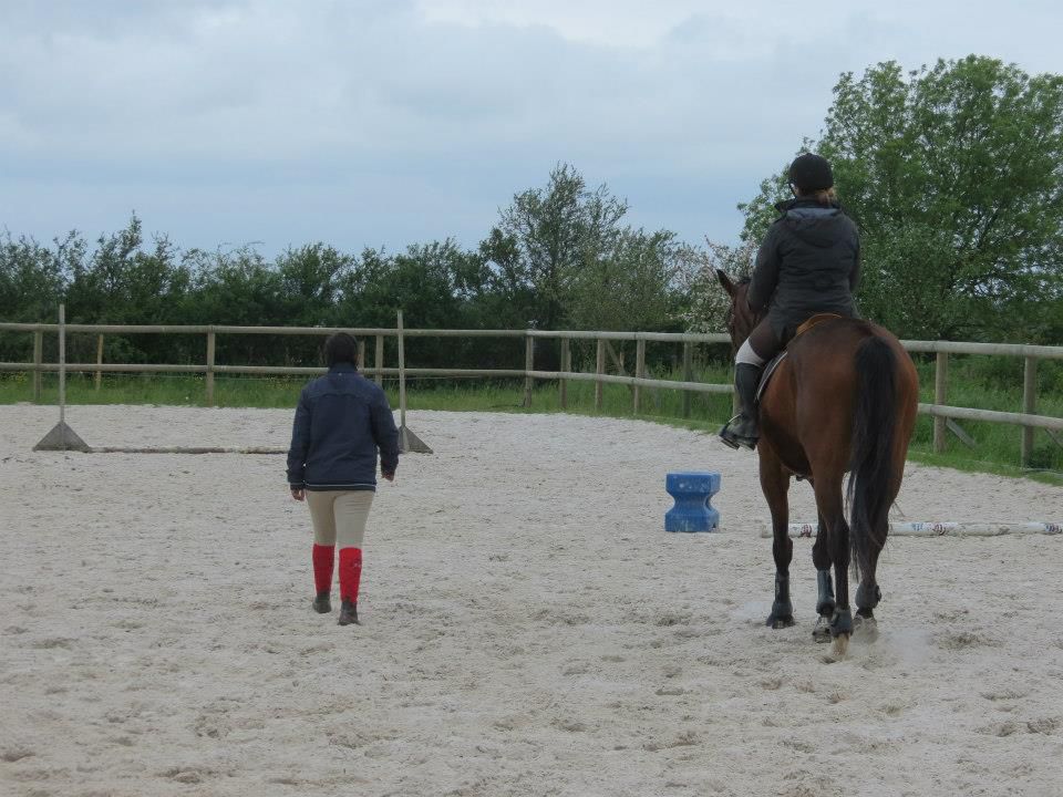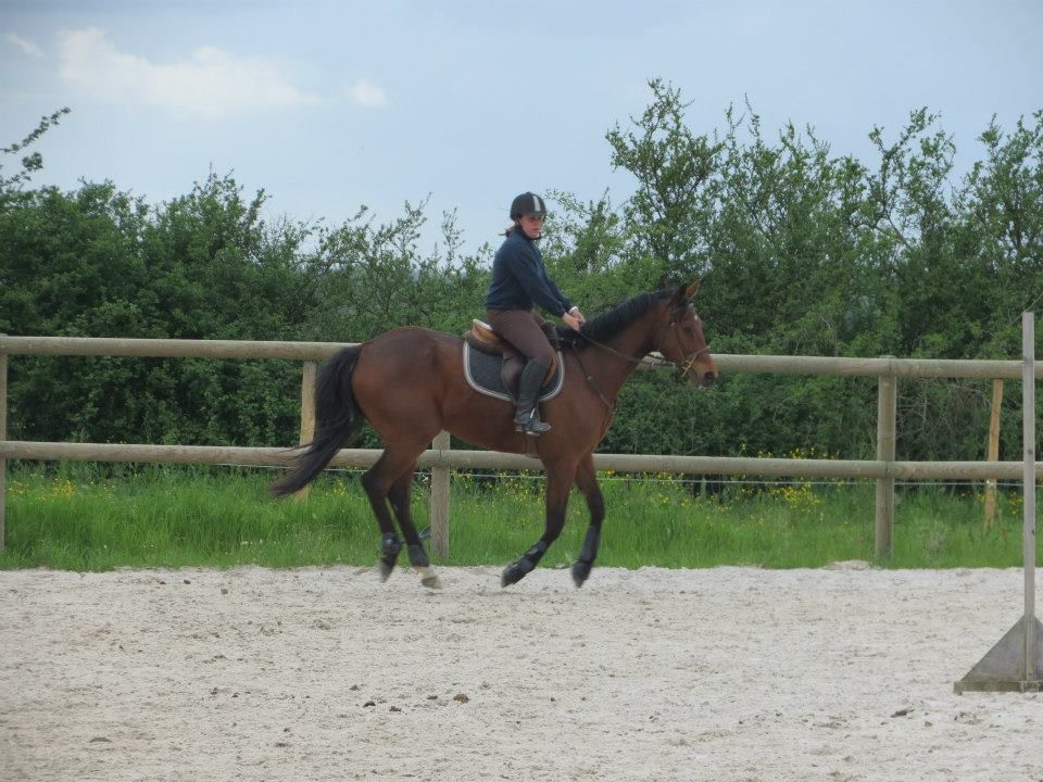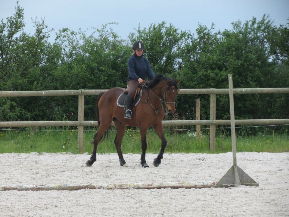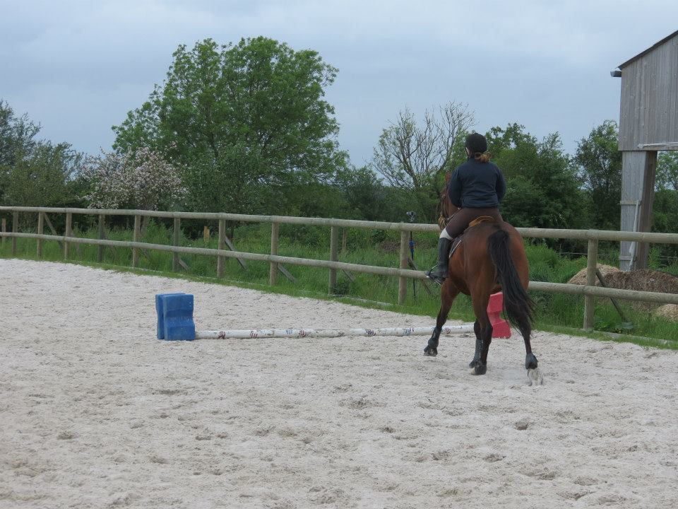 | Dire merci | Des nouvelles. Mercredi, temps de chiotes. J'ai récupéré Lasco trempé au pré. Du coup, dos sensible et chatouilleux. J'étais avec ma DP, on montait toutes les 2. On a opté pour les RA histoire qu'il ne se mette pas à la retourne avec son dos sensible et qu'il s'échauffe au mieux. C'est ma DP qui a commencé et elle en a chié. Lasco n'a pas été très coopératif! Mais il a fini par donner... quoi que même quand il se posait enfin, 3-4 foulées plus loin, il tentait de truander.A mon tour, Lasco est très très sensible de la position de jambes, j'en profite pour bosser sur un cercle sur hanche en dehors, hanche en dedans. Une super réponse mais du mal à l'avoir droit sur le cercle. Ma DP a pointé un gros défaut qui détériore mon travail à main droite, j'ai la main droite tout le temps en arrière de l'autre, du coup, ça tire sur la bouche. Etrangement, pas le soucis à main gauche. Je pense que j'ai naturellement le dos de travers et que ça s'accentue à droite. Il a fallu que je fasse un effort monstrueux dans mon dos pour être le plus droite possible et avancer cette main... dur dur. Le reste de la semaine, pas possible d'aller m'occuper de Lasco, la belle famille était là et j'ai pas eu le temps de m'échapper. Dimanche, beau temps et chaleur. Programme du jour, parcours de barre au sol. Tout simple, 2 lignes de 5 et 6 foulées dans chacune des longueurs, 1 isolé dans la largeur et 1 autre dans la diagonale (que je prenais après une des barres de la ligne pour faire une ligne brisée). Je teste un nouveau mors en ce moment: aiguille double brisure en cuivre. Il tirait trop sur les barres au sol et en saut avec ma DP avec le mors droit en résine. Donc là, on tente celui là sur plusieurs séance et il me plait plutôt bien. Donc la séance, hyper contente, je fesais ce que je voulais de Lasco. 1 foulée de plus ou de moins dans les lignes, des transitions au trot pour changer de pieds tranquillement... Il était super content de faire l'exo mais pas exité. Il est resté super cadensé tout le long, bref, trop agréable, je me suis bien fait plaisir! ![]() |