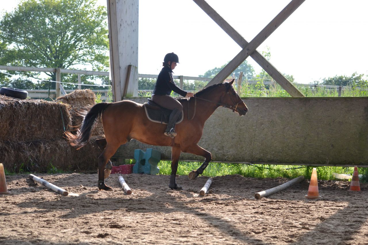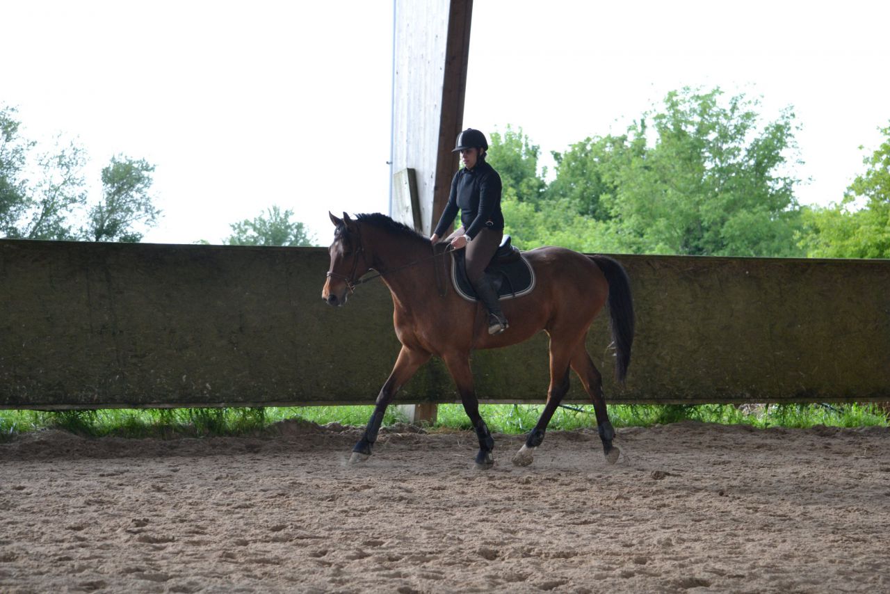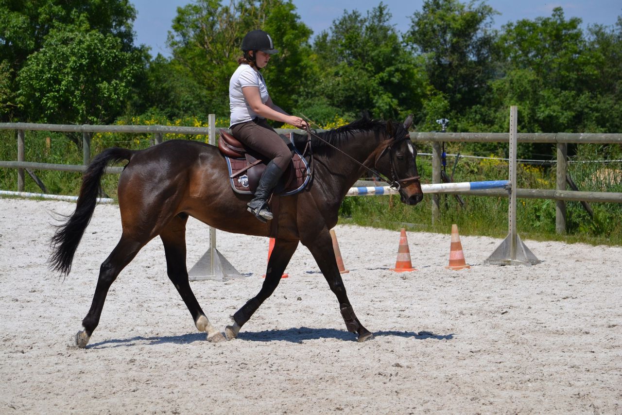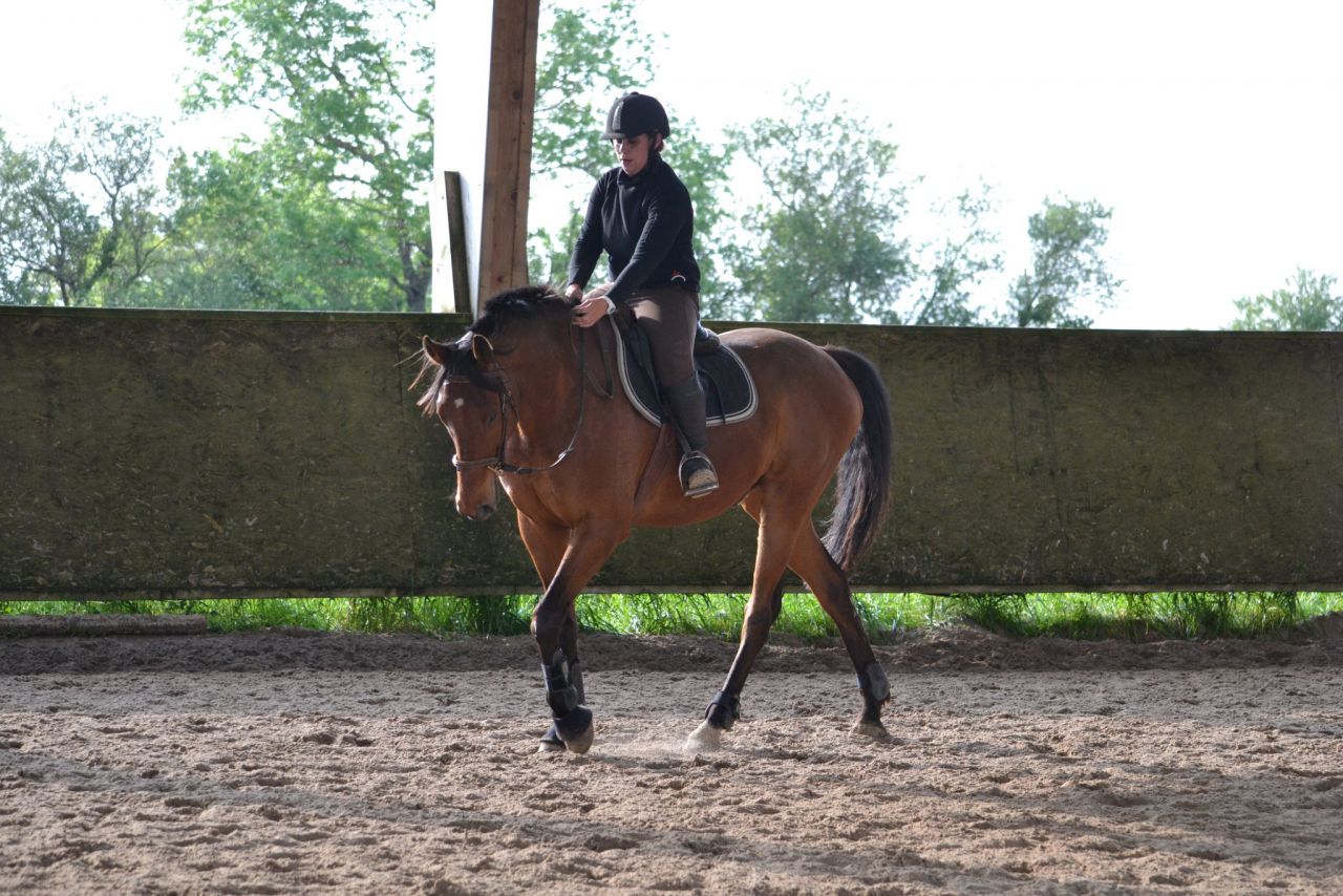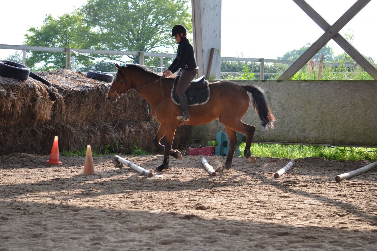 | Dire merci | Hier, un vent de fou, digne d'un mois de février! Je me dis que ça va être folclo! Et bien pas du tout! Lasco a plutôt vraiment bien bossé!4 barres au sol en ligne, espacé de 3m, à passer dans un galop tonic mais plutôt rassemblé. Je détends tranquillement, je fais gaffe à mes mains, je bidouille pas, j'essai d'être bien posé au desssus de mes 2 pieds. Je semble plus stable que la veille. Lasco lui est un peu mou par rapport à l'exo que je veux faire. J'essai d'enchainer les transitions mais bof. Du coup, je pars sur les barres espérant que ça allait le réveiller. Il était mouuuuuuu! Je profite de la ligne droite pour remonter la carrière dans un galop plus soutenu. Même un peu trop rapide pour aller sur les barres, je profite de la courbe pour m'assoir, le galop devient plus rebondi, je passe les barres... et je lache dans mes jambes sur les dernières (donc lui il repasse au trot). Je fais un autre passage comme ça où je galère et après ça, c'était bon, j'avais le galop qu'il fallait. Je fais la même chose à l'autre main, ça passe après un 1er passage pourri. Petite pause, Lasco a déjà un peu chaud. Je trouve que c'est pas mal, mais Lasco semble galéré à passer la dernière barre à chaque fois. Il semble faire une foulée bien plus longue. Ma prof est dans le coin, elle m'a vu bosser. Elle me dit juste de refaire la même mais de me redresser au max (trop avachis sur ma selle, son dos ne peut pas s'articuler correctement) Bizarement, ça marche du tonerre! Essai à l'autre main, ça passe bien. Mais nouveau soucis, Lasco antissipe le virage et n'est plus droit sur la dernière barre. Hop, on refait en demandant un arrêt derrière. La 1ère fois, il est surpris. La 2ème, il passe droit, je sens la garrot monter, l'arrêt est légé... Bon bah j'arrête là! Trop bien! ![]() A la base, j'étais censé surélever la 1ère barre et la dernière... Mais j'ai mis trop de temps à régler les petits soucis. Une autre fois, cet exo simple n'est pas assez routinier pour nous, à refaire. J'ai vraiment bien aimé. Je me suis sentie mieux que la veille à cheval. Je pense aussi que mes mains, c'était mieux. J'ai même pas eu le soucis que j'ai pardois de ne pas assez suivre le balancier de l'encolure sur des barres au sol, là, ça roulait vraiment bien. Enfin j'ai eu cette impression! |
