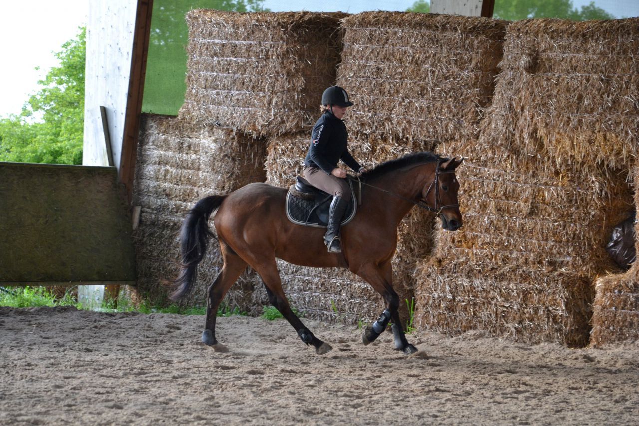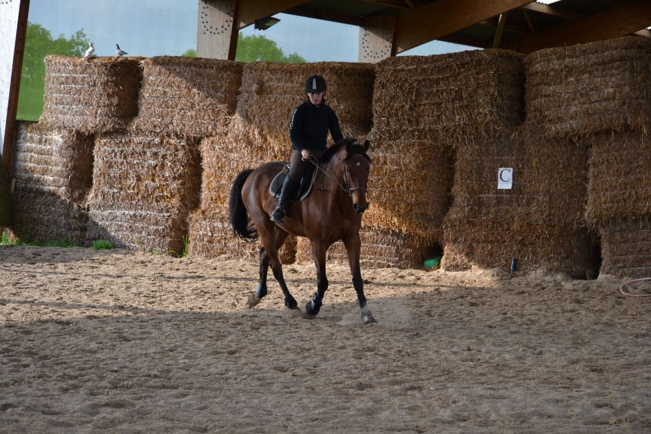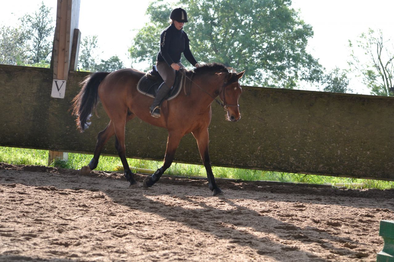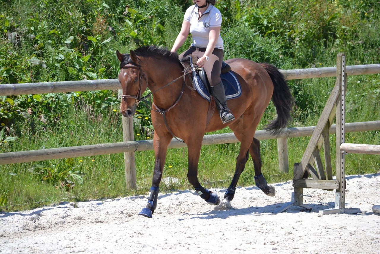 | Dire merci | Hier, un vent de fou, digne d'un mois de février! Je me dis que ça va être folclo! Et bien pas du tout! Lasco a plutôt vraiment bien bossé!4 barres au sol en ligne, espacé de 3m, à passer dans un galop tonic mais plutôt rassemblé. Je détends tranquillement, je fais gaffe à mes mains, je bidouille pas, j'essai d'être bien posé au desssus de mes 2 pieds. Je semble plus stable que la veille. Lasco lui est un peu mou par rapport à l'exo que je veux faire. J'essai d'enchainer les transitions mais bof. Du coup, je pars sur les barres espérant que ça allait le réveiller. Il était mouuuuuuu! Je profite de la ligne droite pour remonter la carrière dans un galop plus soutenu. Même un peu trop rapide pour aller sur les barres, je profite de la courbe pour m'assoir, le galop devient plus rebondi, je passe les barres... et je lache dans mes jambes sur les dernières (donc lui il repasse au trot). Je fais un autre passage comme ça où je galère et après ça, c'était bon, j'avais le galop qu'il fallait. Je fais la même chose à l'autre main, ça passe après un 1er passage pourri. Petite pause, Lasco a déjà un peu chaud. Je trouve que c'est pas mal, mais Lasco semble galéré à passer la dernière barre à chaque fois. Il semble faire une foulée bien plus longue. Ma prof est dans le coin, elle m'a vu bosser. Elle me dit juste de refaire la même mais de me redresser au max (trop avachis sur ma selle, son dos ne peut pas s'articuler correctement) Bizarement, ça marche du tonerre! Essai à l'autre main, ça passe bien. Mais nouveau soucis, Lasco antissipe le virage et n'est plus droit sur la dernière barre. Hop, on refait en demandant un arrêt derrière. La 1ère fois, il est surpris. La 2ème, il passe droit, je sens la garrot monter, l'arrêt est légé... Bon bah j'arrête là! Trop bien! ![]() A la base, j'étais censé surélever la 1ère barre et la dernière... Mais j'ai mis trop de temps à régler les petits soucis. Une autre fois, cet exo simple n'est pas assez routinier pour nous, à refaire. J'ai vraiment bien aimé. Je me suis sentie mieux que la veille à cheval. Je pense aussi que mes mains, c'était mieux. J'ai même pas eu le soucis que j'ai pardois de ne pas assez suivre le balancier de l'encolure sur des barres au sol, là, ça roulait vraiment bien. Enfin j'ai eu cette impression! |