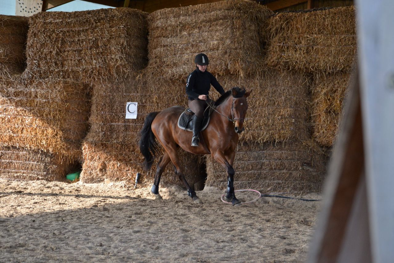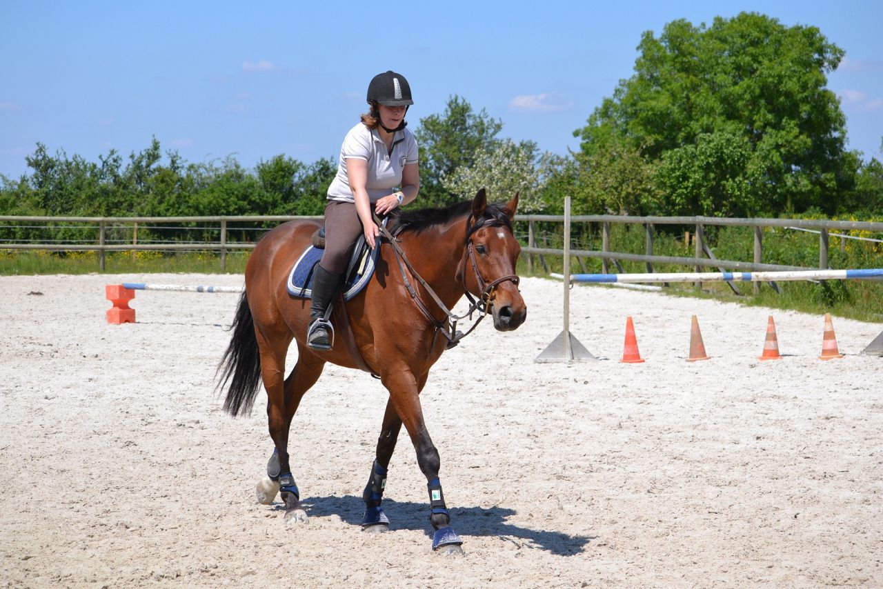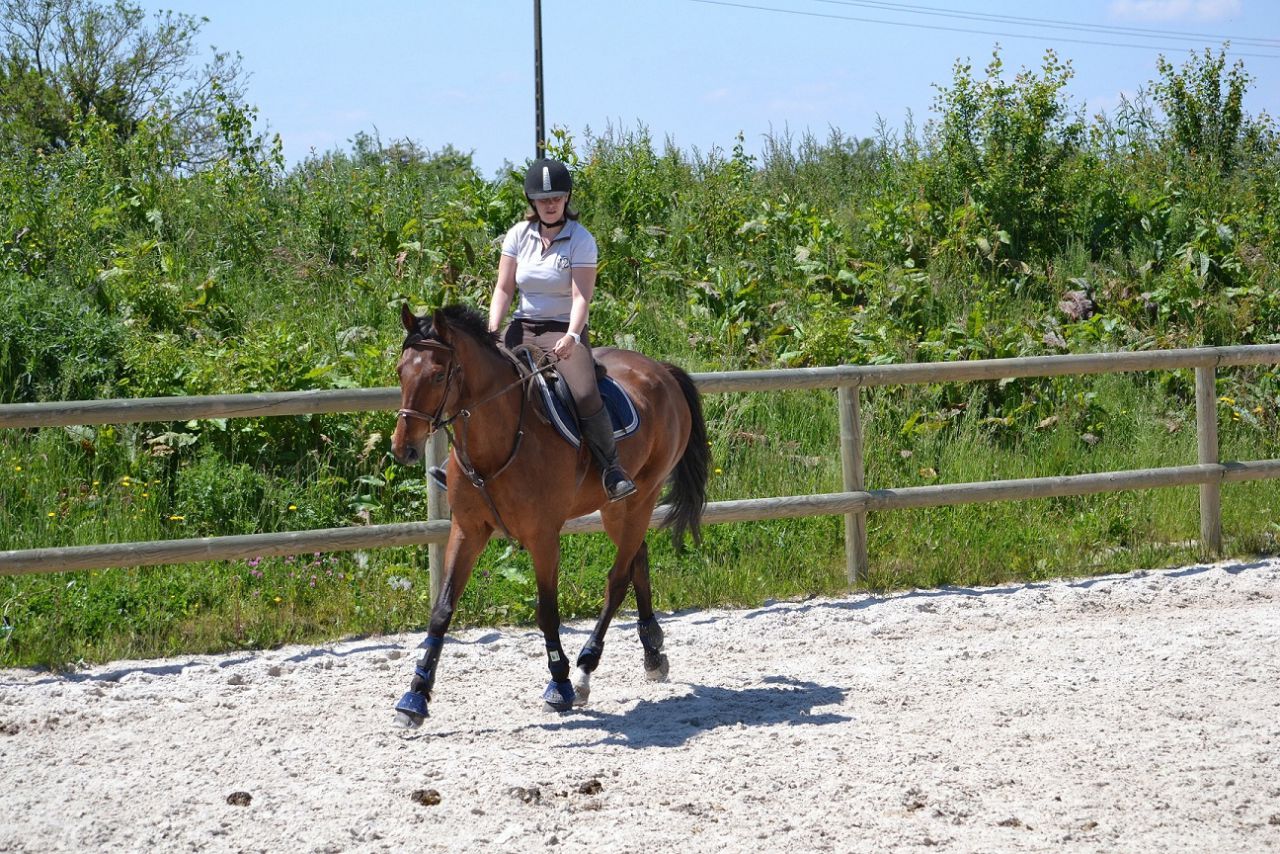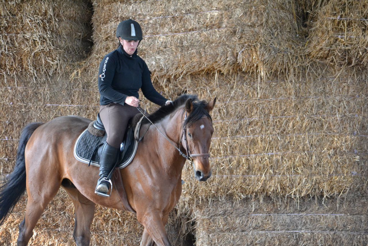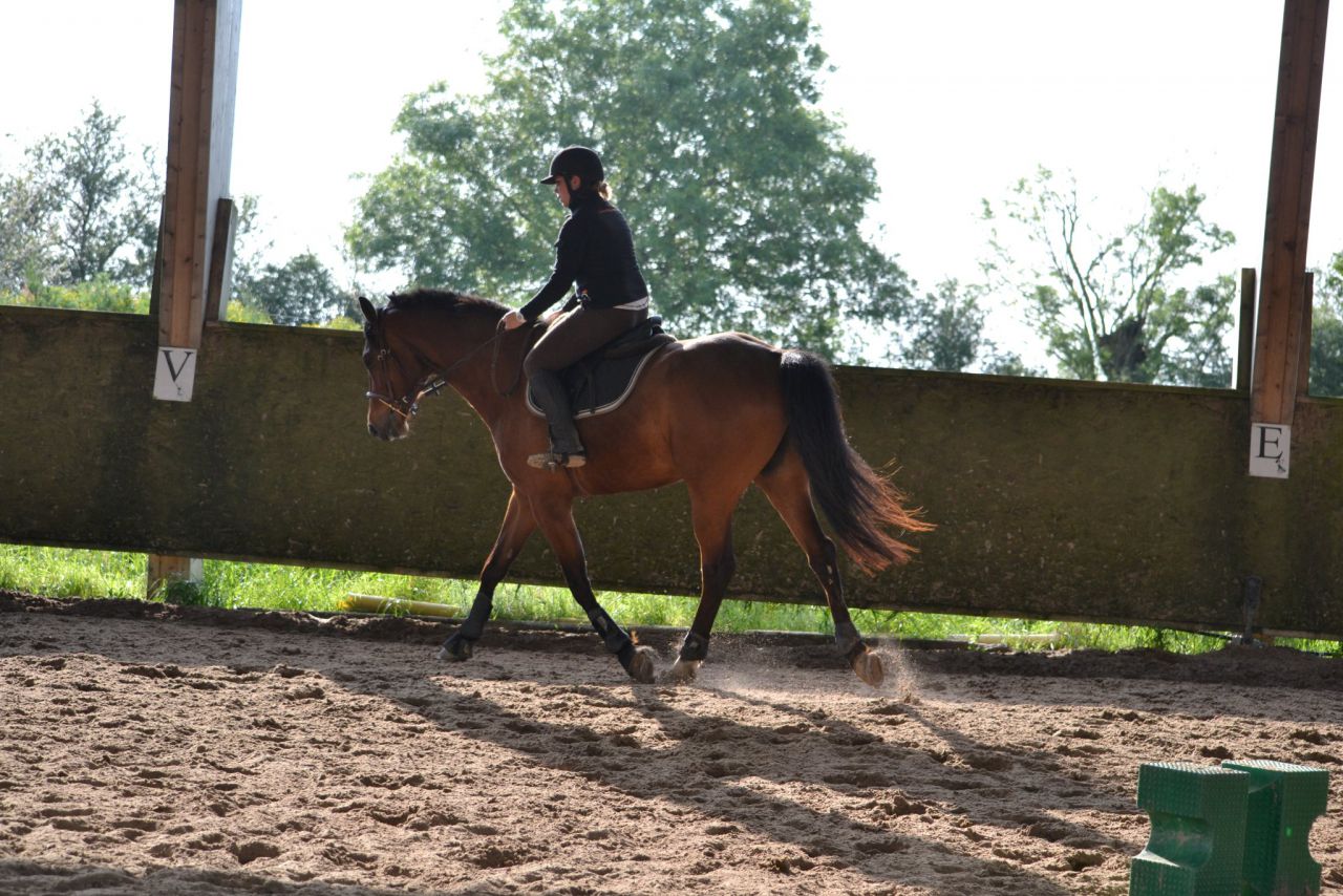 | Dire merci | Hier, un vent de fou, digne d'un mois de février! Je me dis que ça va être folclo! Et bien pas du tout! Lasco a plutôt vraiment bien bossé!4 barres au sol en ligne, espacé de 3m, à passer dans un galop tonic mais plutôt rassemblé. Je détends tranquillement, je fais gaffe à mes mains, je bidouille pas, j'essai d'être bien posé au desssus de mes 2 pieds. Je semble plus stable que la veille. Lasco lui est un peu mou par rapport à l'exo que je veux faire. J'essai d'enchainer les transitions mais bof. Du coup, je pars sur les barres espérant que ça allait le réveiller. Il était mouuuuuuu! Je profite de la ligne droite pour remonter la carrière dans un galop plus soutenu. Même un peu trop rapide pour aller sur les barres, je profite de la courbe pour m'assoir, le galop devient plus rebondi, je passe les barres... et je lache dans mes jambes sur les dernières (donc lui il repasse au trot). Je fais un autre passage comme ça où je galère et après ça, c'était bon, j'avais le galop qu'il fallait. Je fais la même chose à l'autre main, ça passe après un 1er passage pourri. Petite pause, Lasco a déjà un peu chaud. Je trouve que c'est pas mal, mais Lasco semble galéré à passer la dernière barre à chaque fois. Il semble faire une foulée bien plus longue. Ma prof est dans le coin, elle m'a vu bosser. Elle me dit juste de refaire la même mais de me redresser au max (trop avachis sur ma selle, son dos ne peut pas s'articuler correctement) Bizarement, ça marche du tonerre! Essai à l'autre main, ça passe bien. Mais nouveau soucis, Lasco antissipe le virage et n'est plus droit sur la dernière barre. Hop, on refait en demandant un arrêt derrière. La 1ère fois, il est surpris. La 2ème, il passe droit, je sens la garrot monter, l'arrêt est légé... Bon bah j'arrête là! Trop bien! ![]() A la base, j'étais censé surélever la 1ère barre et la dernière... Mais j'ai mis trop de temps à régler les petits soucis. Une autre fois, cet exo simple n'est pas assez routinier pour nous, à refaire. J'ai vraiment bien aimé. Je me suis sentie mieux que la veille à cheval. Je pense aussi que mes mains, c'était mieux. J'ai même pas eu le soucis que j'ai pardois de ne pas assez suivre le balancier de l'encolure sur des barres au sol, là, ça roulait vraiment bien. Enfin j'ai eu cette impression! |