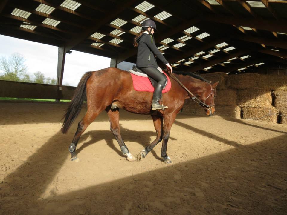 | Dire merci | Grosse séance pour Lasco hier soir. Ma DP est venue le monter. J'avais prévu un exo de barres au sol , 4 barres sur un cercle. Le genre d'exo qui le chauffe bien! ![]() Déjà pendant la détente, j'installais les barres, et je le voyais du coin de l'oeil qui trottait super fort. Fin de détente, je les fais partir sur l'exo au trot. Je demande cadense réguilère, impulsion, incurvation sur le cercle et je corrige ma DP sur sa position. Autant dire que les 10 premières minutes, c'est un peu du n'importe quoi. Ma DP a été surprise, elle ne pensait pas l'exo aussi dur. Mais elle s'accroche. Ca finit par être pas mal au trot. On passe au galop... re n'importe quoi! Lasco saute les barres, galope n'importe comment. La DP se fait trimballer. Mais elle s'applique toujours. Franchement, elle écoute, elle réfléchis et ça, c'est top. En insistant, en bossant, elle finit par enfin obtenir ce que je voulais. Galop CALME, bonne cadense, incurvation pas mal du tout... Grosse pause. Je vire 2 barres, surélève 2 autres et dessine un grand ovale avec des plots. Même exos, sur l'ovale, 2 mini barres à sauter, mais je veux toutes les mêmes choses d'avant. Dur au début, mais ils ont fini sur un truc top. On laisse là dessus, ils sont rincés. Ma DP fait une très bonne analyse de sa séance, je trouve ça bien. Et elle est toujours aussi motivée, malgré la connerie de Lasco toute la séance (parce que j'avoue, il ne l'a pas aidé ) |