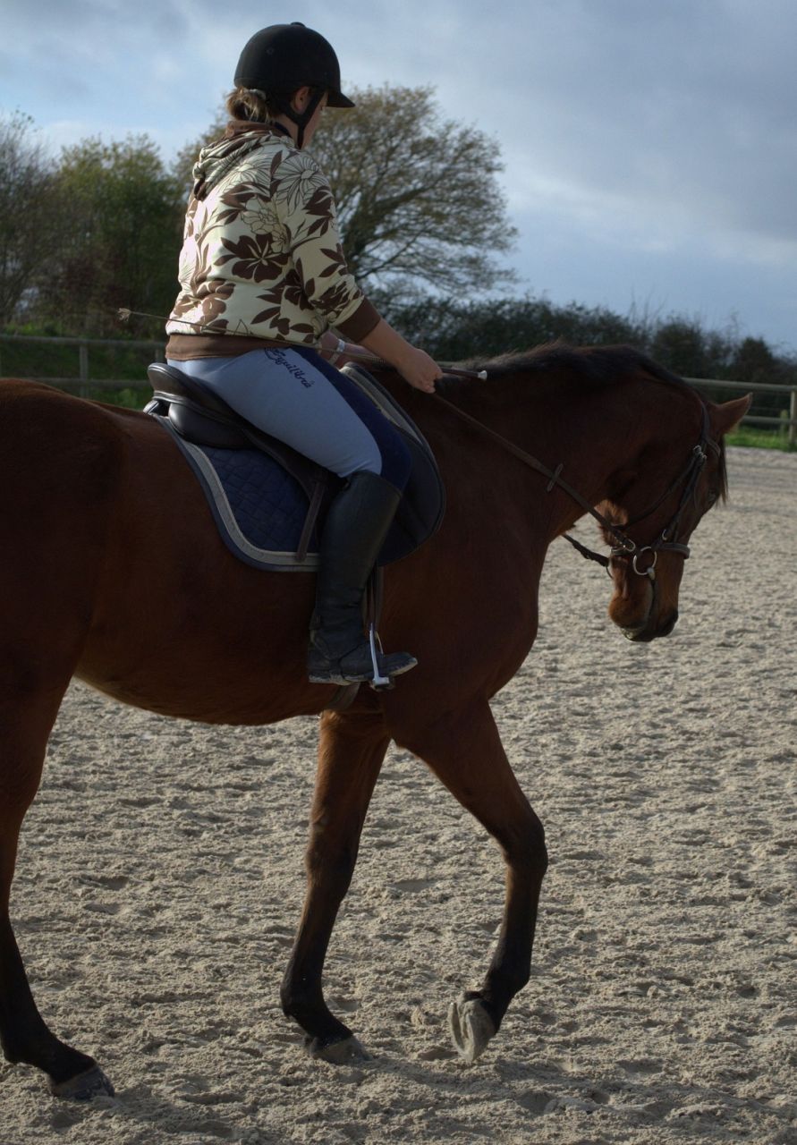| Dire merci | Hier je n'avais qu'à ouvrir les doigts, il restait dans cette même attitude et j'avais l'impression qu'il volait... c'était magique C'est la sensation que j'ai eu sur qq foulées que j'ai eu le week end d'avant! C'est un truc de dingue. Mais bon là, je n'avais pas vraiment d'autre choix que de le garder lent. La copine qui était là me disait qu'il se jugeait, il n'avait pas le c*l à la traine du coup, j'ai pas chercher plus. On n'a pas passé qu'asi toute la séance à le garder détendu devant. Et c'est vrai qu'en fin de séance, au trot, j'ai redemander un peu plus de trot en ligne droite. Il ne s'ouvrait pas vraiment, il cherchait à s'entendre devant, c'était bien, mais toujours se rebond qui m'empêchait de le suivre correctement. |