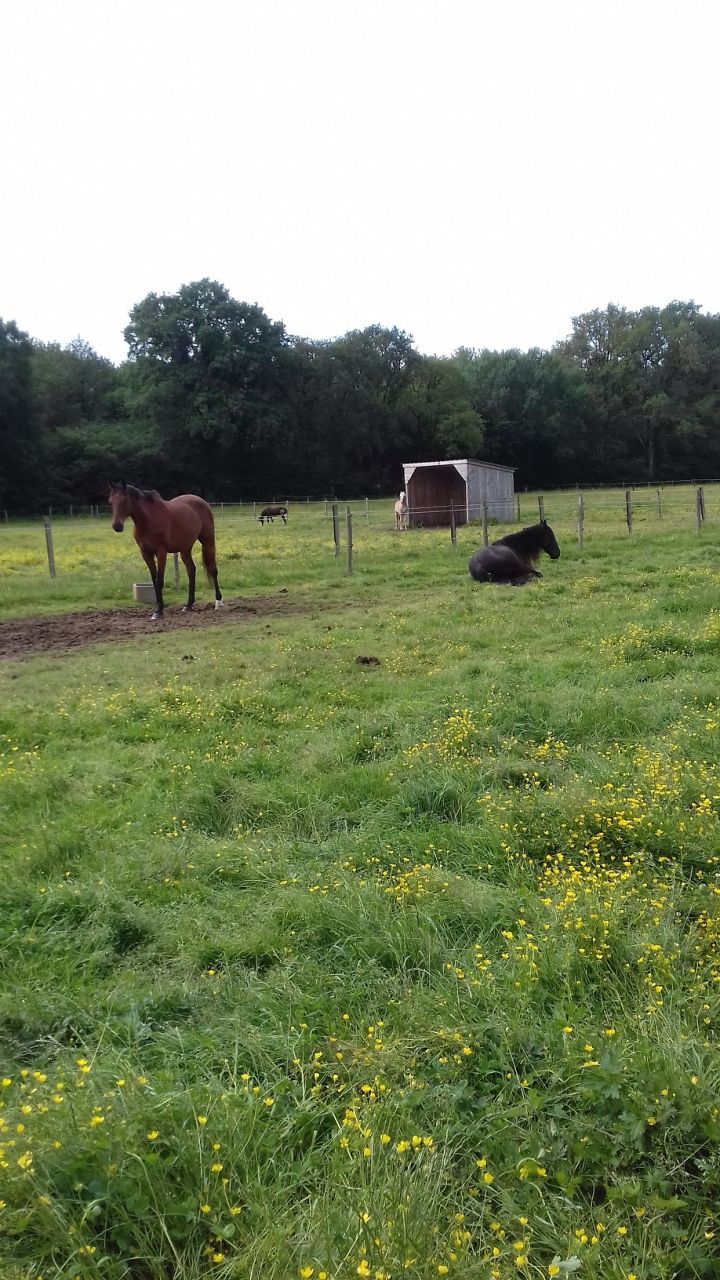 | Dire merci | *** suite *** Par contre, on n'a pas galopé. La fin de séance, on a travaillé les transitions descendante et les arrêt et je pense que Lasco c'était mis en tête qu'on allait galoper. Il se défendait fort sur son mors (alors que je touchais à peine aux rênes), cherchait à prendre la main... bref, du grand Lasco. Et avec cet état d'esprit, B. m'a interdit de le galoper (vu qu'il vit au pré et que je le travaille beaucoup à pied, c'est pas l'occasion qui lui manque)A un moment, il est redescendu en pression d'un coup. Pendant quelques minutes, j'en faisais ce que je voulais. On a vite fait retravaillé au trot, refait pas mal de transitions... extra. On a laissé là dessus. ![]() Bon par contre moi, je suis plutôt déçu de moi même. Je trouve que j'ai vraiment du mal à appliquer les consignes. Combien de fois est-ce que j'ai laissé Lasco couper son cercle alors que je sais que c'est un spécialiste pour ça. Je devrais anticiper? Non? Combien de fois je n'ai pas pris le temps de faire mon changement de main et que j'ai été trop vite et coupé trop court. A un moment je me suis excusé auprès de B, l'impression qu'il me répètais 10 fois la même chose et que mon cerveau ne percutait pas... Je déteste quand je suis comme ça. je ne comprends pas d'où ça vient, et se comportement ne m'aidera pas à avancer... ![]() Sinon, quelques photos de rien du week end, parce qu'après tout, on est sur le forum photo! ![]() Pas très flatteur ![]() ![]() En pleine sieste avec son super pote de pré! On voit derrière le poulain de Cockail ![]() |