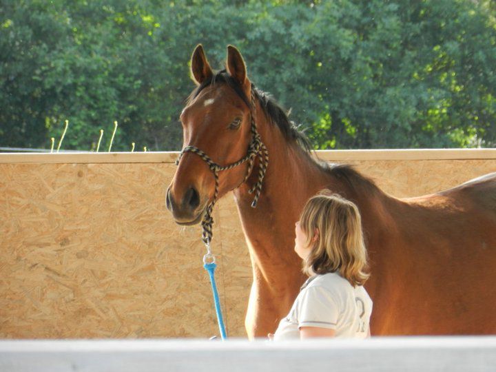 | Dire merci | Bon passons à autre chose. Hier soir, il faisait chaud et lourd. J'arrive au club, je vais chercher Lasco (qui était au bout du pré ). Il a du pas mal transpirer dans la journée, le poil humide et collé dans certaine zonde. L'amie avec qui je fais de l'étho était là. Youpi, ça fait au moins 4 ou 5 semaines que je n'ai pas bossé avec elle, c'est l'occasion! ![]() On révise les bases; céder à la pression, déplacement des hanches, des épaules, reculés, jeu du cercle, rapelle, stick too me... A ma grande surprise, il n'avait absolument rien oublié!!! Une séance d'une heure très variée où on a même pu inclure des nouveautés (slalom en stik too me et en déplacement des hanches et/ou des épaules). Génial.J'ai découvert ce matin qu'une amie qui était au bord du manège en a profiter pour prendre quelques photos. Il a l'oeil étrange sur celle là! ![]() ![]() Concentré sur les instructions qu'on me donne... ![]() |