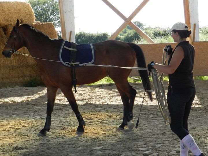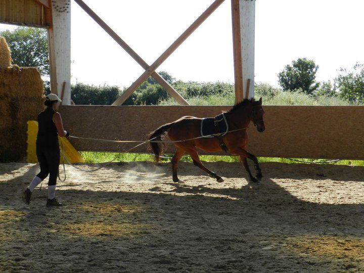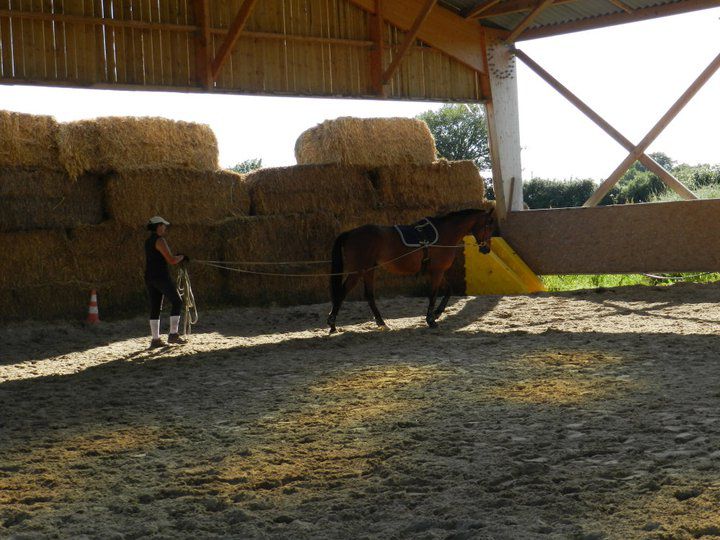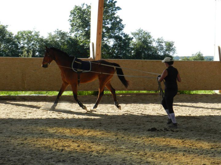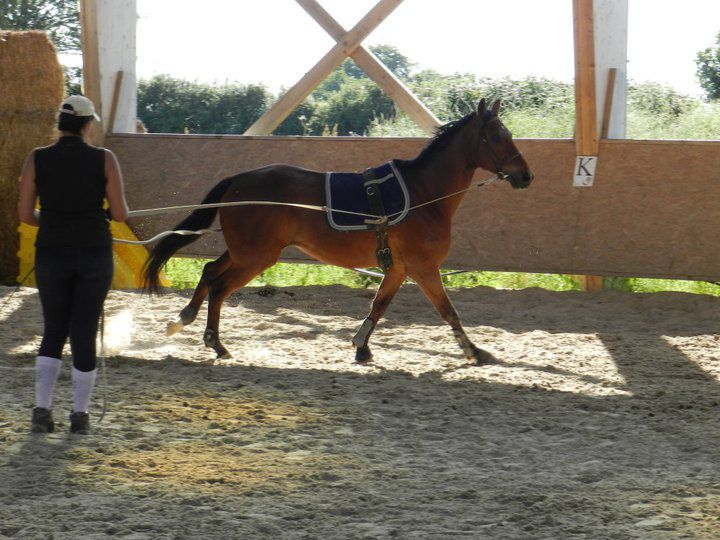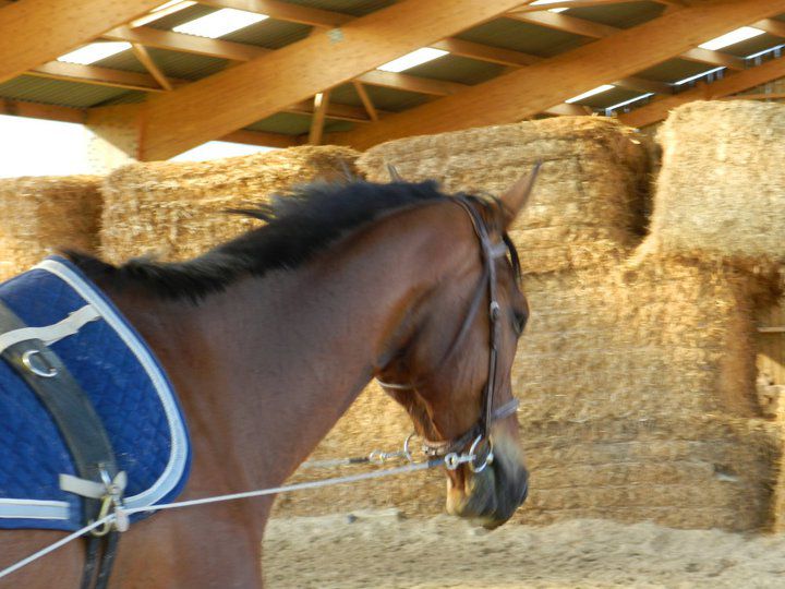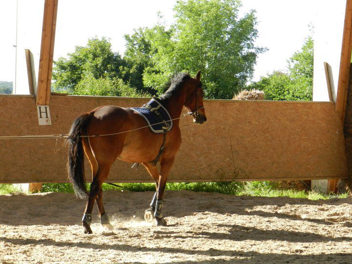 | Dire merci | Donc hier soir, CP! Je rentrais tout juste de stage, après 4h de route... j'étais naze. Ma prof me propose de bosser en liberté... mais une autre idée que j'avais en tête depuis un moment me vient en tête: Les longues rênes!!! ![]() Comme ma prof adore ça, c'est parti. Donc c'est elle qui prend Lasco en main, pour lui apprendre à lui et moi, j'observe. Début difficile, forcément, il ne comprend pas trop ce qu'on attend de lui. On commence avec la rêne extérieur qui passe sur le dos. Lasco concentré mais stressé, les changements de main sont laborieux. Mais petit à petit, il finit par comprendre et sort des allures de dingue! ![]() ![]() ![]() ![]() ![]() Il fait trop mastoc sur cette photo! ![]() ![]() |