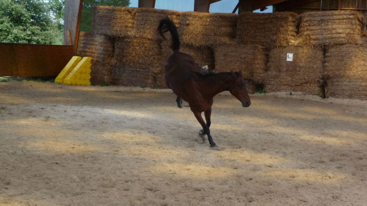 | Dire merci | jument_Noire, ça devait être trop sympa comme épreuve! Dommage. Mais quand je vois comment j'ai récupéré Lasco, je suis contente d'avoir été là. 1ère fois que je le vois comme ça, même si je sais que c'est une réaction normal, ça m'a fait peur. J'ai donc fait une petite séance en liberté. Je voulais juste qu'il bouge, m'assurer qu'il allait bien. Et en faite, il a été exceptionnel! ![]() Je ne sais pas comment dire. En faite, il m'a vite montré qu'il était en forme et qu'il avait envie de bouger. Mieux que ça, il voulait jouer. Et avec moi. Les copains au pré aidant, ça faisait les fous et galopaient dans tous les sens. Lasco les regardait, naseaux grands ouverts. Je commence à le faire marcher, trotter. Il secoue la tête, il veut passer à la vitesse supérieur... J'étais étonner de le canaliser dans ce grand manège. Juste en le fesant changer de mains régulièrement. Il restait au trot, avec des allures de malades. 1ère fois que je le vois avec la queue légèrement relevée, des foulées de trot allongés comme jamais. et ce port de tête... Il cranait. Je demande le galop, il part. Il secoue la tête. Je sens qu'il veut exploser. Je sors un petit cri, genre "hiphip", très aigue et bam, coup de cul. Et il repart dans son galop cool. J'étais morte de rire. Par la suite, il ne pêtait en l'air que quand je faisais ce petit cri. Excellent, vraiment. Et malgré son côté trop maigre qu'il a en ce moment, je l'ai trouvé beau!!! Je ne m'étais jamais autant amusé en liberté. Il était totalement sous contrôle, toujours l'oreille interne vers moi. J'ai vraiment eux cette impression de jeux avec moi. C'était génial. Sur la fin, pour le fun, petites barres à sauter. Il s'y est pris comme un gros nul, vous verrez sur les photos, mais il y allait de bons coeur! Machin tout fin... ![]() Il fait maigre ![]() ![]() Il fait plus maigre ![]() ![]() ![]() ![]() |