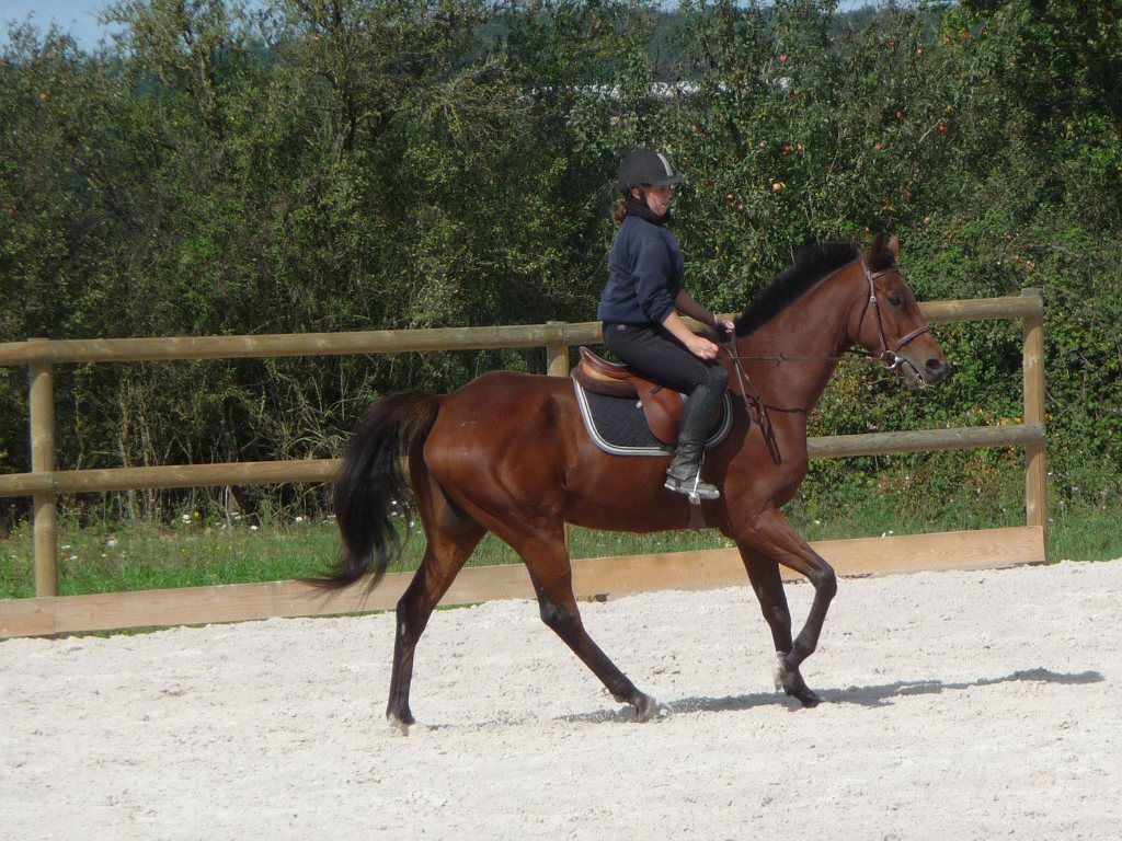 | Dire merci | Sinon, j'ai récupéré les photos de la séance de dimanche dernier. Le résumé que j'avais fait à ce moment là: Il faisait beau, un peu frais... Petite séance en carrière. Lasco était pleins d'énergie! J'adore! Mais comme je n'étais plus habitué à ça, je galère un peu pour être à ma place. Pendant tout un temps, il était mou. Il falait sans cesse surveiller son impulsion pour qu'il se maintienne. Là, il faut plus que je le retienne et que je le mette sur les fesses pour éviter qu'il précipite trop et parte sur les épaules. Pas facile, mais j'ai du être morte de rire toute la séance à le voir avec autant de pêche. J'ai bossé surtout en cercle, au pas, au trot. Essayer de l'avoir à peut près rond, mais pas facile. J'ai bossé ensuite pas mal sur les départ au galop du pas. Il m'en a fait de magnifiques. Limite, je voyais son antérieurs partir très haut et très loin! Il a vraiment pas mal bossé. Au bout de 20 minutes, les obstacles installées dans la carrière me faisait de l'oeil. Mais pas mon gilet et Lasco sans protections... Melle De Vauper était là et en tant que nouvelle diplomée monitrice, elle m'a filée un coup de main. Les obstacles n'étaient pas haut... 50 cm je pense. J'ai commencé par la croix au trot, puis au galop en enchainant les 2 autres. Ca m'a fait trop de bien de sauter. Encore une fois, Lasco bien réactif et agréable. Bon, j'ai fait un peu de caca, je manquais de jambes, mais c'était sympa. |