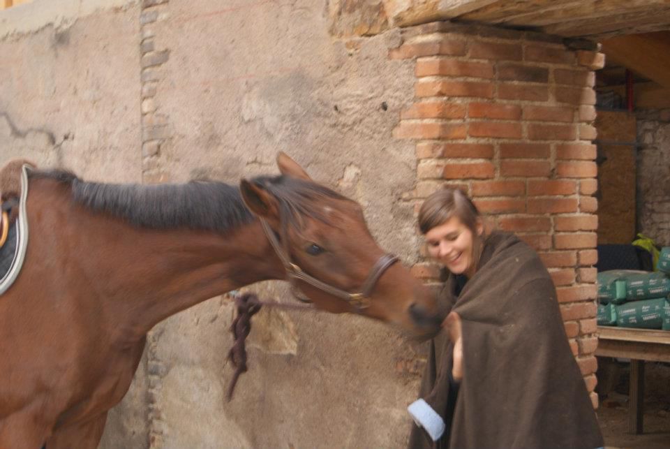| Dire merci | Un bon week end cheval! ![]() Jument_Noire m'avait gentiment proposé son aide la semaine dernière pour régler un petit soucis que je n'arrivais pas seule (déplacer les hanches, les épaules) et pour me faire un peu sauter. Samedi matin, direction le club. Il fait froid... ça change des températures du week end dernier! On arrive au paddock, Lasco ne tique pas! Youpi! ![]() Licol et on part vite aux écuries se mettre à l'abri du vent. Et qui c'est qui se croyait encore en été et qui n'avais pas pris de blouson... ![]() Trop mignon Lasco, il a pas arrêté de la chercher comme ça. J'avais pris toute une série de photos trop mimi, mais elles sont toutes flous... ![]() Un bon pansage, je selle et on pars en manège... Jument_Noire me fait bosser ma descente de jambe pendant la détente, au pas, sans étrier. On s'échauffe gentiment à cette allure puis je rechausse et on passe au trot. Lasco est direct en avant, lègé, posé sur le mors. Il respecte bien l'incurvation à main droite, il faut que je demande plus fort à main gauche, mais il me fait vraiment une bonne détente. Moi, je me concentre surtout sur ma main intérieur, pour qu'elle reste souple et surtout... qu'elle NE TIRE PAS. Et jument_Noire me corrige au fur et à mesure. Sur les photos, c'est flagrant comme cette main, si elle tiraille, je perds toute la bonne attitude de Lasco. ![]() ![]() ![]() ![]() ![]() ![]() ![]() Ensuite, au galop. La main intérieur quasi tout le temps basse. Alors que la main intérieur est plutôt bien mise. Jamais à la même hauteur... Faut que je retravaille ça. ![]() ![]() ![]() ![]() |