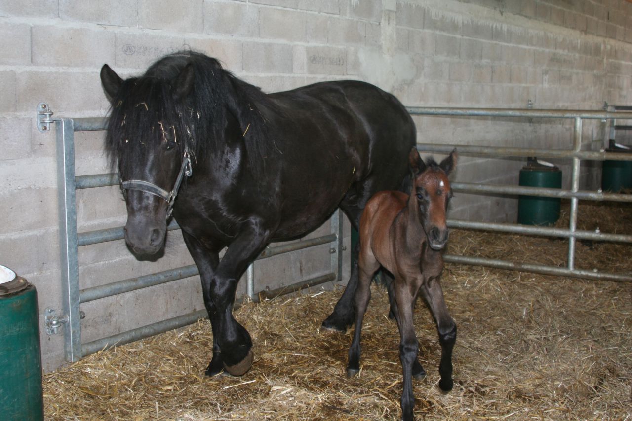 | Dire merci | Arrff il était noir de chez noir aux extremités: naseaux, autour des yeux et les membres noirs! Je savais que j'avais une chance sur deux pour qu'il soit gris mais comme le papa était vraiment ce que je cherchais niveau caractère et performance... Pas grave je vais peindre le ptit Ca va qu'il a une bonne bouille et un bon ptit caractère parce que j'aime pas le gris ![]() Ynnaf mon poulain s'appel Calisto de Montfort il est né le 29 avril |