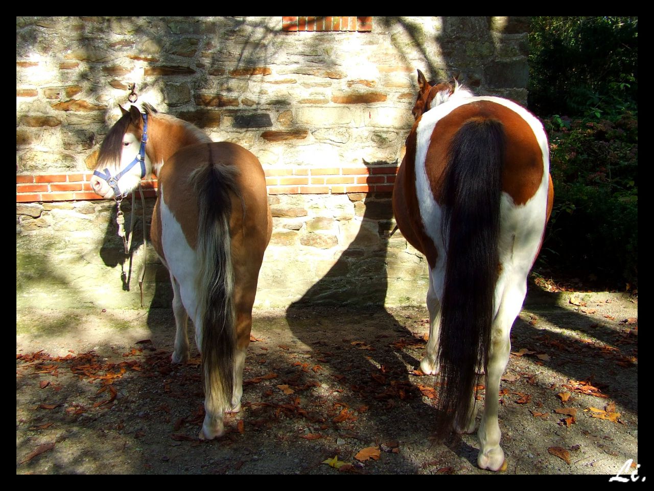 | Dire merci | Nous revoilà! Après une petite pause sur le forum, l'envie de donner des nouvelles et de refaire un post sur ma troupe de démangeais! et bien c'est chose faite ![]() Pas grand chose de nouveau, beaucoup de glandage au pré, beaucoup de gratouilles et de papouilles, mais peu de travail. Résolution 2011 : bosser! On repart de plus belle pour cette nouvelle année, en commençant par des photos avant/après! Tout d'abord voici Pongo, que je ne présente plus appelé aussi Pongolito, Pongo l'abricot, ou encore Pongo le rouleur de pelles ONC pie bai de 2004. Il est entré dans ma vie le 1er mai 2008 pour mon plus grand bonheur, et fît de moi une propriétaire comblée! A son arrivée: ![]() Aujourd'hui: ![]() Ensuite vient le tour de Pablo, mieux connu sous le nom de Pablolito ou Pablo l'asticot. ONC pie isabelle de 2002. Il est arrivé le 4 juillet 2009 quasiment sauvage, obèse et en mauvais état. Il me fallait un compagnon pour Pongo, autant en profiter pour faire une B-A! Je l'ai donc remit en état, en confiance aussi. maintenant il accepte un cavalier sur son dos, on commence aussi à faire quelques pas montés!A son arrivée: ![]() Aujourd'hui: ![]() Puis c'est au tour de la dernière recrue! Comme je disais il s'agit d'un compagnon pas comme les autres, puisque canin! Je vous présente donc Fast du Domaine des Gardiens de la Vallée, petit berger belge (malinois) né le 22 février 2010! Il est adorable et s'entend bien avec ses deux compères. A son arrivée: ![]() Aujourd'hui: ![]() |