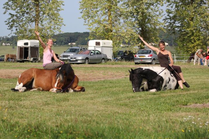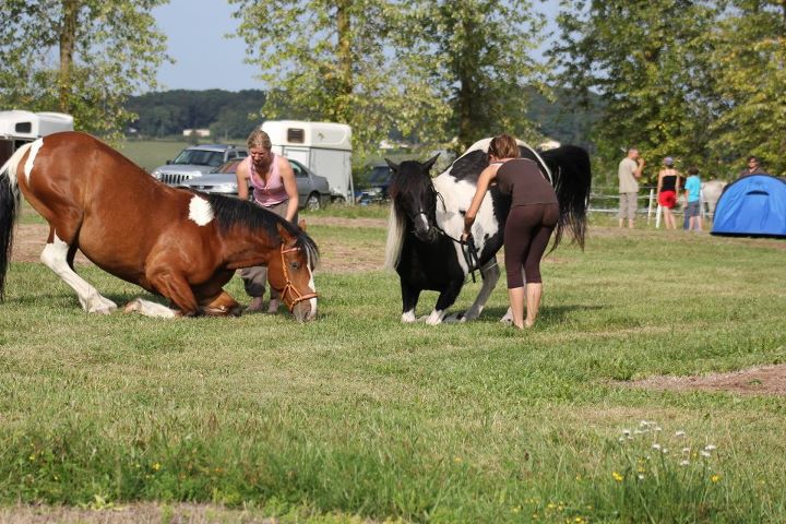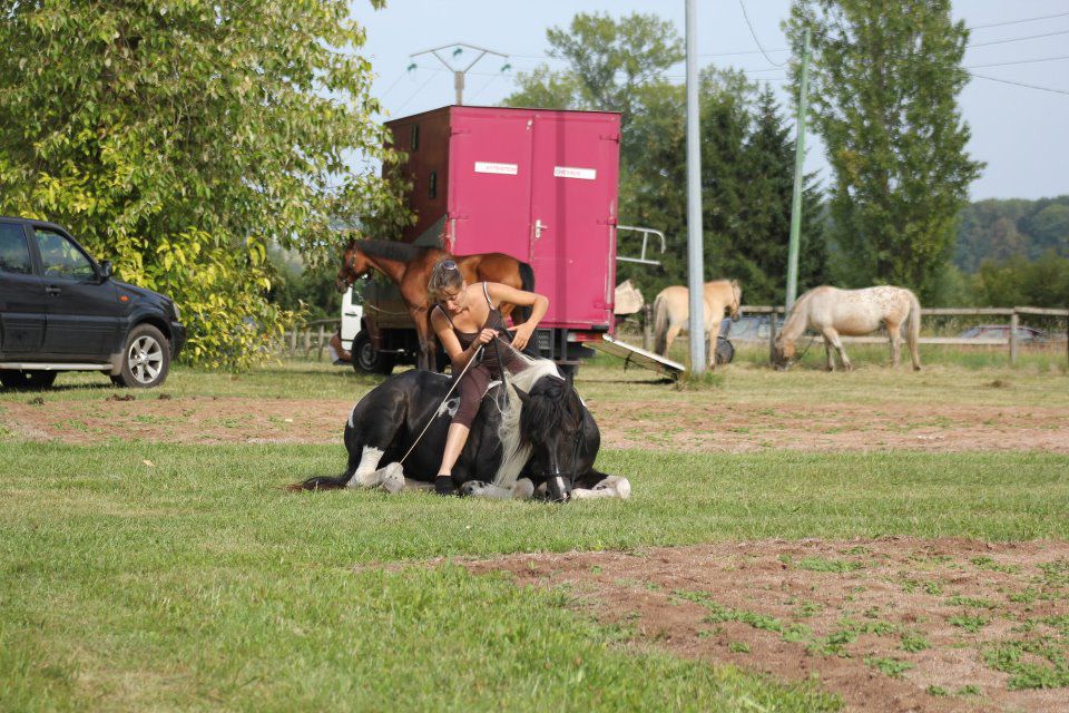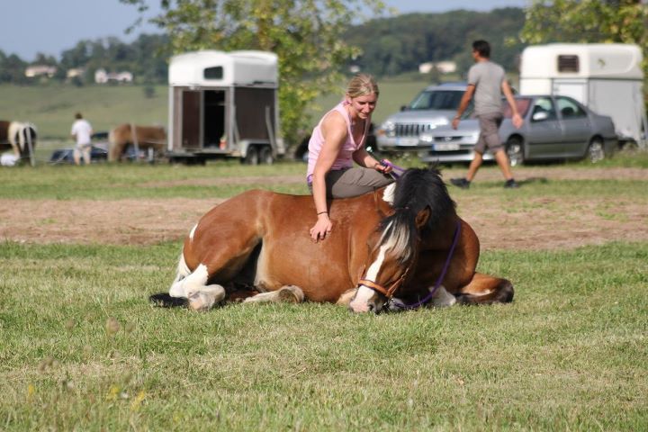 | Dire merci | Une autre fois on se fait un truc enxemble mammouthe! mais je vais etre trop jalouse de ton gros j'en veux trop un comme ça mdr on n'est pas très très loin l'une de l'autre, faut se programme des choses ![]() Bon ce matin séance de reprise du travail avec Savane, pas trop mal, par contre elle a complètement zappé les déplacements latéraux montés sans rien, donc on a repris. Et... première chute avec ma Savane! On était en train de trotter en licol + rènes, et elle a fait un mini écart à cause de je ne sais quoi, et comme la terre glisse bcp par ici... on est tombées toutes les 2. J'ai tout vu au ralenti, j'ai prié pour ne pas qu'ellelne me tombe dessus mais dans ces cas là tu ne peux que prier car tu ne maitrises rien. J'ai été éjectée, je crois que c'est juste mon pied qui a pris, peut etre est il resté en dessous je ne m'en suis pas rendue compte mais j'ai un peu mal. Mais je n'ai rien du tout ouf! et Savane non plus. |