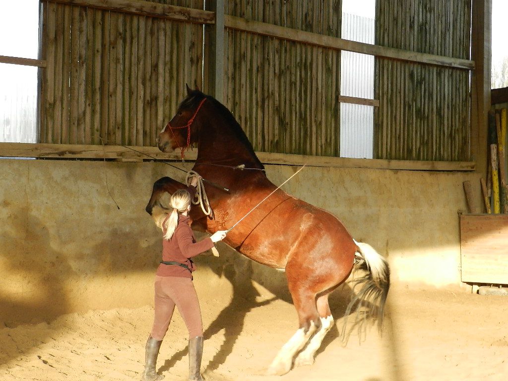 | Dire merci | je ne sais pas trop, tout reste à définir on sera avec une troupe de 20 autres chevaux mais chacun présentera son petit truc Savane était une booooombe aujourd'hui au manège!!!!!! Merveilleuse! bien sûr je n'ai pas tenu ma résolution et je l'ai bossée en liberté, ben la séance de longe de samedi lui a été très bénéfique! je n'ai eu aucune fuite, des cercles au pas autour de moi sans que je ne bouge, des galops ensemble à pied, des déplacements latéraux montés en side, bon en cordelette elle avait du mal aujourd'hui mais je pense que je n'ai pas encore trouvé la bonne pédagogie pour lui montrer comment faire les cabrés à pied étaient fabuleux... Par contre on a retravaillé sur le coucher, car elle se met assise et donne la papatte quand elle a décidé, donc on a recommencé 5 ou 6 fois je crois. Après elle se couche du mauvais coté et du coup ne réussit pas à s'asseoir, enfin le bordel mais on a fini sur du positif ![]() elle a été merveilleuse et en plus 'jai plein de photos, va falloir vaincre ma flemmardise ![]() |