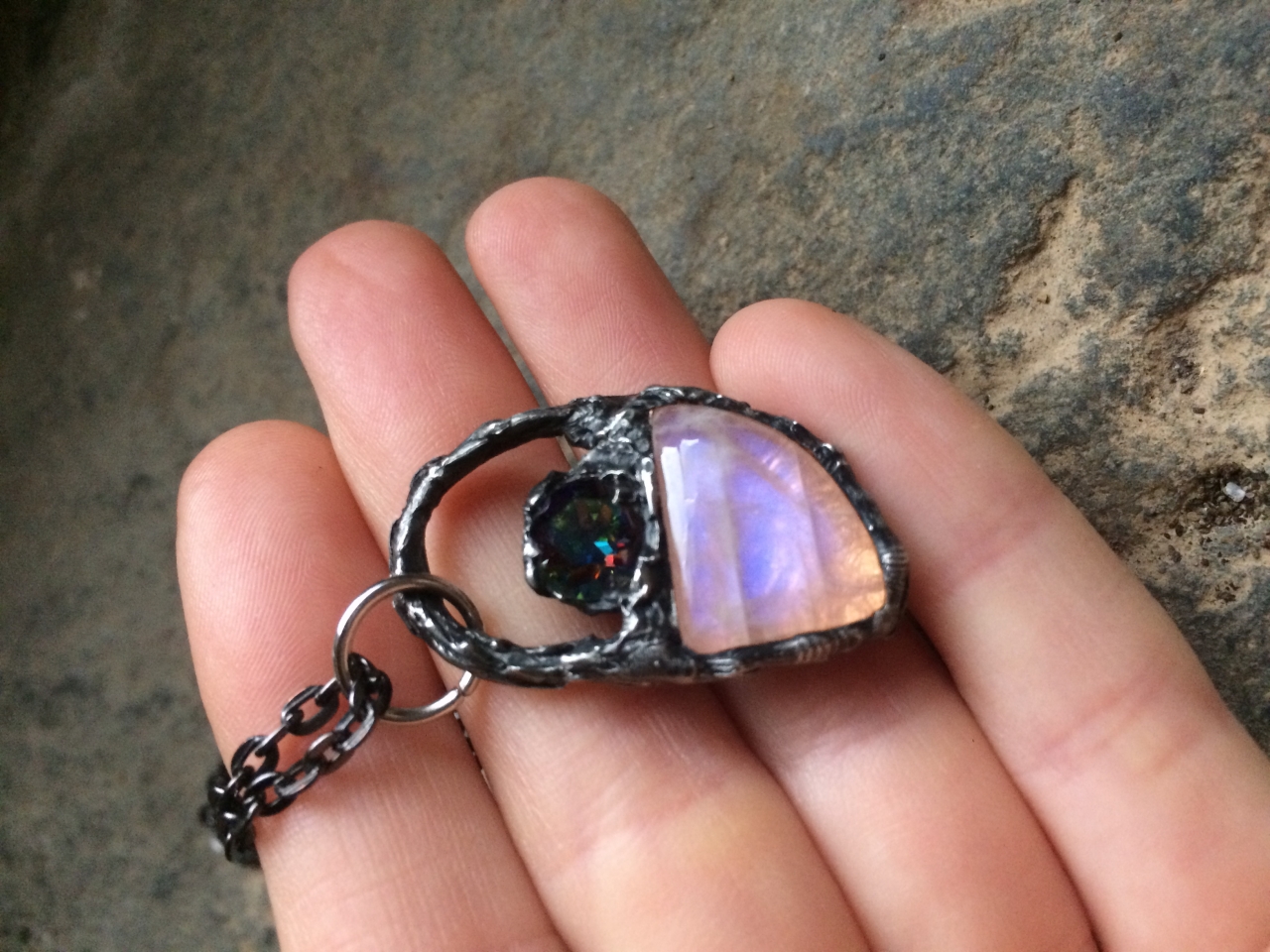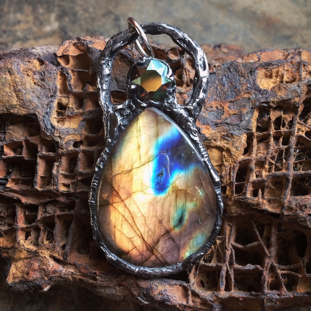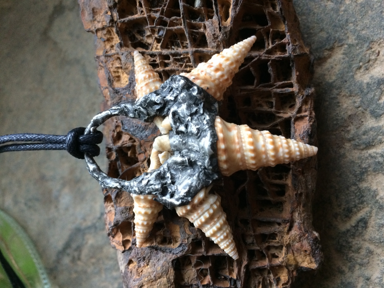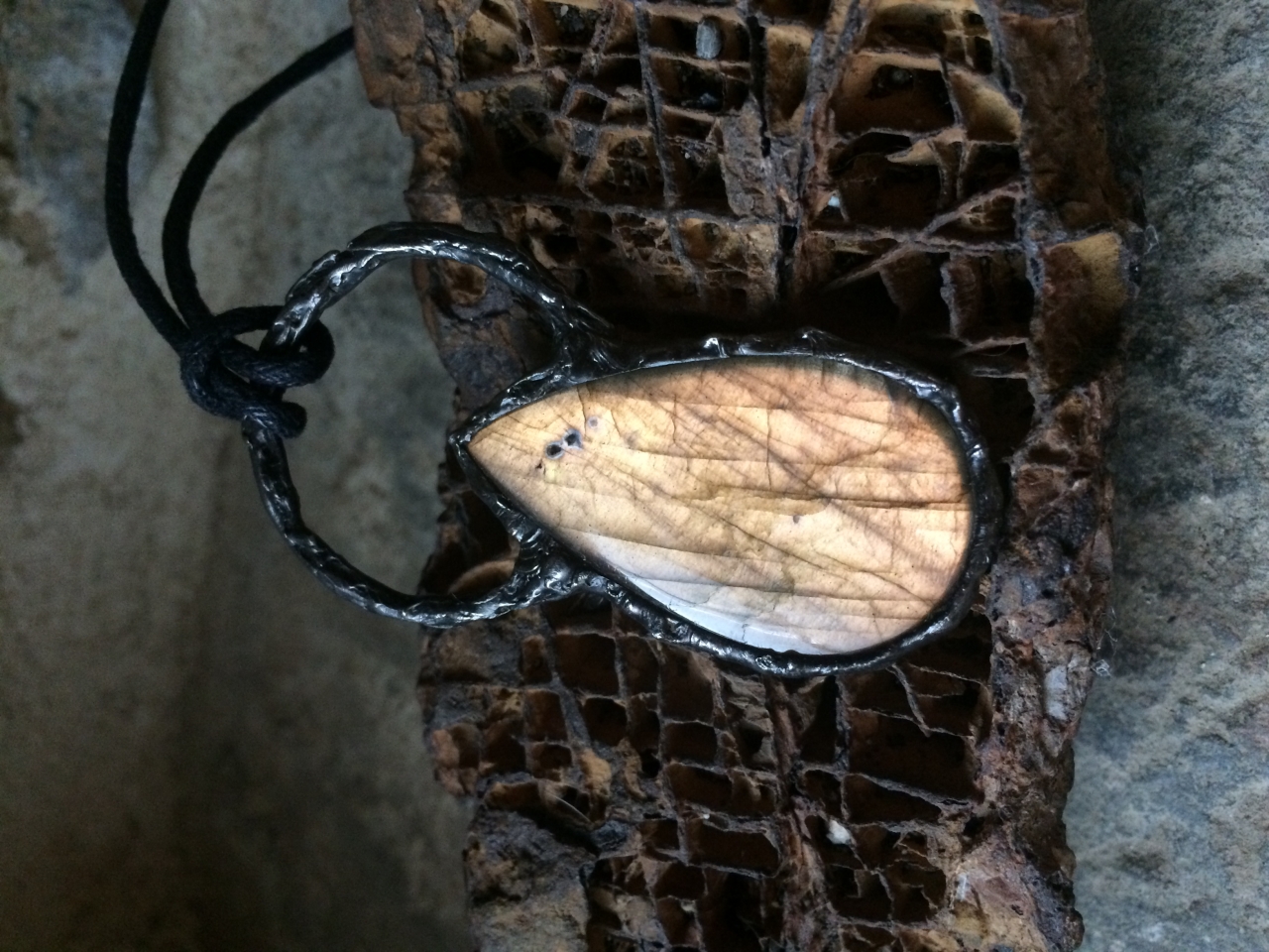 | Dire merci | De l'étain et un fer a souder c'est un dérivé de la technique Tiffany qui sert a faire des vitraux et sertir du verre pour faire les lampes du même nom. Sur ceux que j'ai mis là l'étain est patiné pour lui donner une teinte sombre. sur le bois de cerf c'est de la pâte epoxy, je fais aussi des trucs en résine, avec des inclusions ou en protection par dessus des mini aquarelles que je peins. Mais ma préférence va aux pierres et l'étain. |