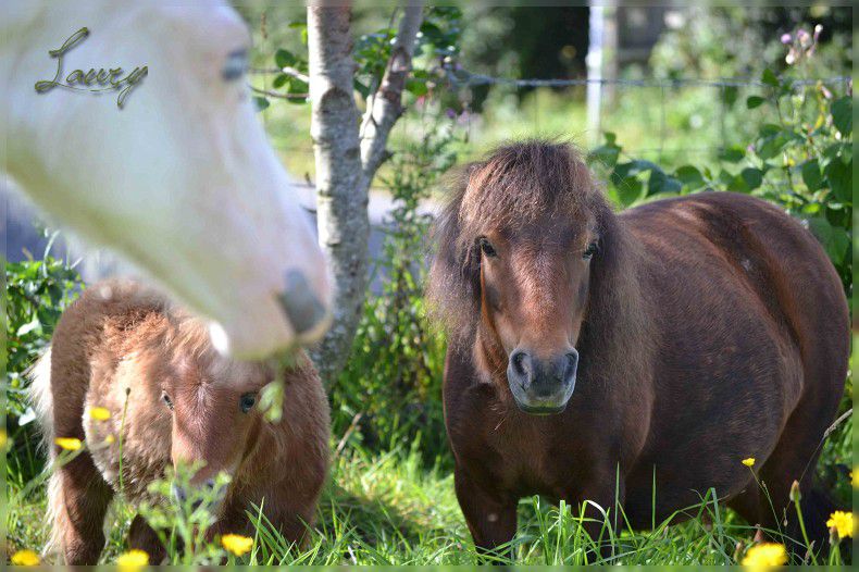 | Dire merci | Bon, racontage rapidos, je charge les photos et je vous met ça après Alors, voilà, 6zo, t'as tout dit ! j'ai acheté une ponette, mini shetland, (enfin ONC) baie brun, 79 cm au garot, elle s'appelle Anaïs, j'ai craqué, une bouille à faire fondre ... Et puis, j'ai craqué une deuxième fois : j'ai pris sa fille avec elle. Une petite alezane zain, qui sera très certainement plus petite que sa mère encore (le papa fait 75 cm au garot) pour du coup la, c'est carrément l'apothéose, elle ferait pleurer tellement elle est mignonne ! Une petite boule de poils, elle a 3 mois, elle a juste 8 jours de moins que Billy et elle lui arrive au genoux Alors, comme je l'ai dit aussi, Anaïs est pleine d'un petit étalon shet PP cream dun, elle est pleine de 3 mois, non échographiée mais bon, son bidou parle de lui même ![]() C'est une crème, elle se laisse attraper, licoler, elle aime juste pas qu'on lui touche les oreilles et elle est apparemment allergique aux vaccins. Sinon, pas de défauts, je suis trop contente. Alors, pour la pouliche elle est tout juste manipulée, j'ai tout à faire, elle aime pas trop qu'on la tripote, elle est hésitante à venir vers nous mais elle est curieuse et ça viendra tout seul. Pour l'instant, j'ai mis Opale et Billy d'un côté, et Anaïs et sa pouliche de l'autre, j'ai tenté de les groupir cet aprem, Opale et Billy sont rentrés dans la partie des 2 pitchounes, ils se sont à peine regardés pendant 1 quart d'heure, après, Billy à fait son curieux, il est arrivé comme un bourrin pour aller dire bonjour, la, Anaïs lui a carrément sauté à la gorge il a détalé comme un lapin il y est retourné 2 3 fois, puis il a compris, il leur fout la paix mais les observent quand même de loin ![]() Au bout d'1 heure et demi, je me dit que c'est bon, je vais pouvoir les laisser ensemble dès aujourd'hui quand soudain : La p'tite pouliche part à l'aventure pour aller dire bonjour à Opale et Billy, Opale la regarde genre ... "heu, c'est quoi ça ? " Billy tout content la regarde venir sans rien faire. Et c'est alors que Anaïs (super maman powa) fooonce sur Opale, toutes dents dehors, les oreilles couchées... et la, Opale, voulant défendre sa progéniture, elle à fait pareil, elle a chopé Anaïs au garot, elle l'a pas mordue, elle a juste chopé du poil mais purée, pas aimable la mère ... ![]() Donc, j'ai laissé 5 minutes, le calme est revenu aussitôt, j'ai quand même remis tout le monde chacun de son côté pour ce soir, je vais attendre un peu pour retenter. ![]() Par contre, j'ai halluciné, la pouliche elle est carrément moins débrouillarde et autonome que Billy, lui il bouffe de l'herbe comme sa mère, la pitchoune, elle croque 2 brins d'herbes de temps en temps mais elle arrête pas de têter, Billy c'est le contraire quoi. Enfin voilààà, à contente moi ![]() |
