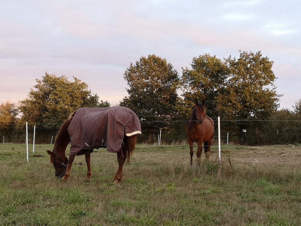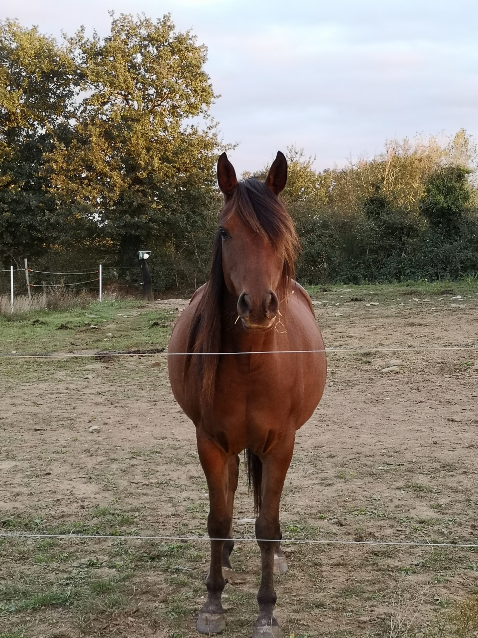 | Dire merci | Des nouvelles de Caïda : elle a toujours l'air abattue, mange peu mais ne semble pas dépérir totalement non plus... Je suis vraiment perdue Je me suis préparée à la laisser partir si ça n'allait pas mieux, mais là ca va ni bien ni mal... Elle a l'œil éteint mais qui s'allume quand je lui propose du pain d'épice qu'elle adore.. Elle est dans un pré à l'écart avec Naïm. Au départ elle était dans un paddock dans son grand pré, mais Naïm ne la quittait jamais donc j'ai demandé à ce qu'ils soient ensemble. Je ne la vois pas retourner dans son pré avec les autres, même si ça ne changerait pas grand chose pour l'accès à la nourriture puisqu'elle ne mange presque pas de foin ![]() |