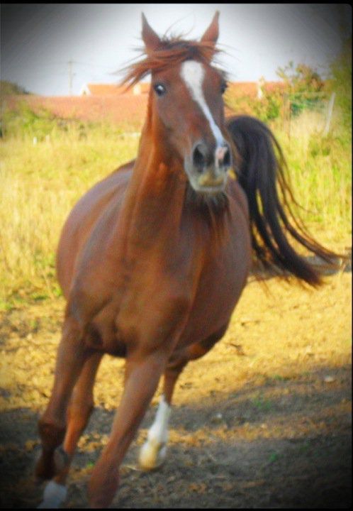 | Dire merci | pur sang arabe a 75 pour 100 et le reste anglo arabe je pratique le dressage et la Balade elle s'appelle schadow elle est née le 14 juillet 2006 |