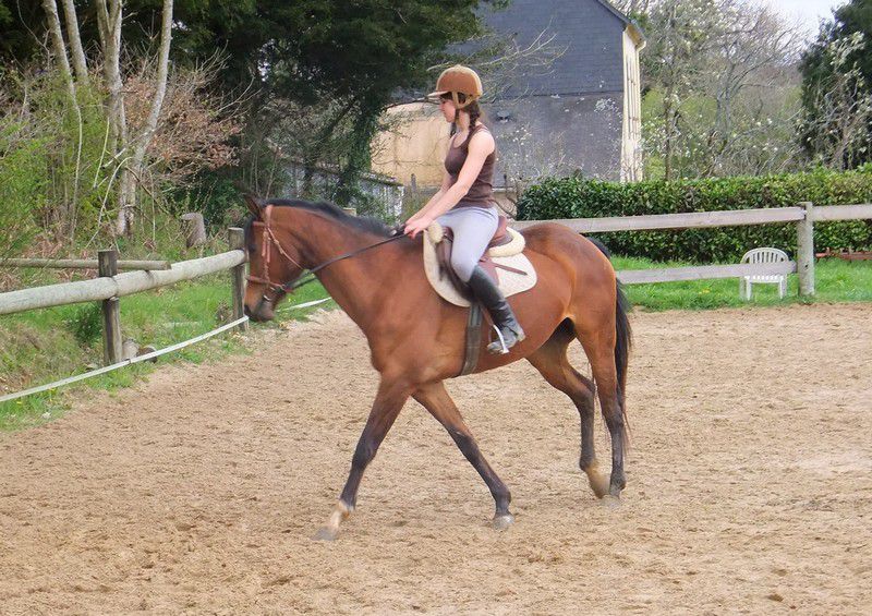 | Dire merci | Une vidéo de début du mois. Le travail autour des transitions trot/galop/trot n'est pas très propres, le retour à l'équilibre dans la descendante est plutôt difficile ! Mais avec le terrain en pente dans la largeur, c'est compliqué de faire vraiment mieux malheureusement ! Par contre j'aime bien son pas ample et décontracté en début de vidéo, et son trot s'améliore aussi ! |