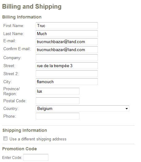 | Dire merci | Bon ben là, tu rentres tes coordonnées![]() Shipping information, c'est si tu veux être facturée à une adresse différente Edit : tu dois rentrer ton numéro de téléphone, sinon, ça ne marche pas... Message édité le 08/08/12 à 11:29 |