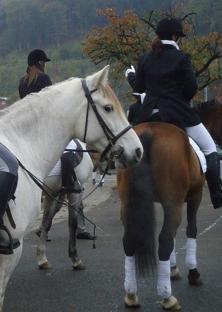 | Dire merci | Nous on ne fait pas de tour dans la ville (en même temps, y'a rien ). On est tous dans l'enceinte de l'Abbaye de Villers-la-Ville, on a droit à une messe (youhouuu!), y'a des enfants qui chantent... Méga faux , les cors de chasse habituels, puis on se met en file pour aller se faire bénir (de l'eau, un bout de pain et des bonbons pour nous cette année ), on se retrouve ensuite tous à un autre endroit où l'on peut attacher les chevaux pour déguster du vin chaud (gratuit )Celle de Baisy-Thy c'est différent, on n'y va plus que pour la balade, d'ailleurs c'est triste mais chaque année y'a moins de chevaux. A celle-là il y a un rallye sympa, mais avec le temps pourri de cette année ça faisait déjà long pour les chevaux (5h à cheval sans la faire et j'avais une ponnette à prêter, pas très grande donc je voulais pas abuser... Même si elle en redemandait ) Je pense que ça fait environ 9 ans que je les fais... Et cette année ça a été la première fois avec le cheval que j'ai en pension depuis quasiment 6 ans D'habitude on me prête des chevaux de marchand que j'essaye la semaine ou le jour avant ![]() |